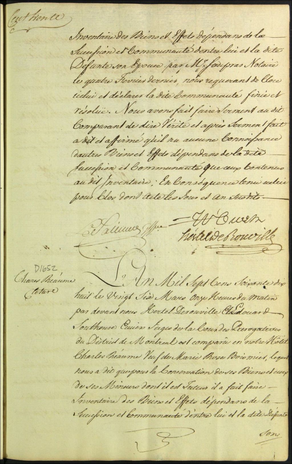 Clôture d'inventaire des biens de la succession et de la communauté de feu Marie Rose Boismier [Marie Rose Beaumier Boisme] et Charles Réaume, 26 mars 1778, Archives nationales à Montréal, Fonds Cour supérieure. District judiciaire de Montréal. Procédures en matières non contentieuses, (06M,CP601,S5,D1652).