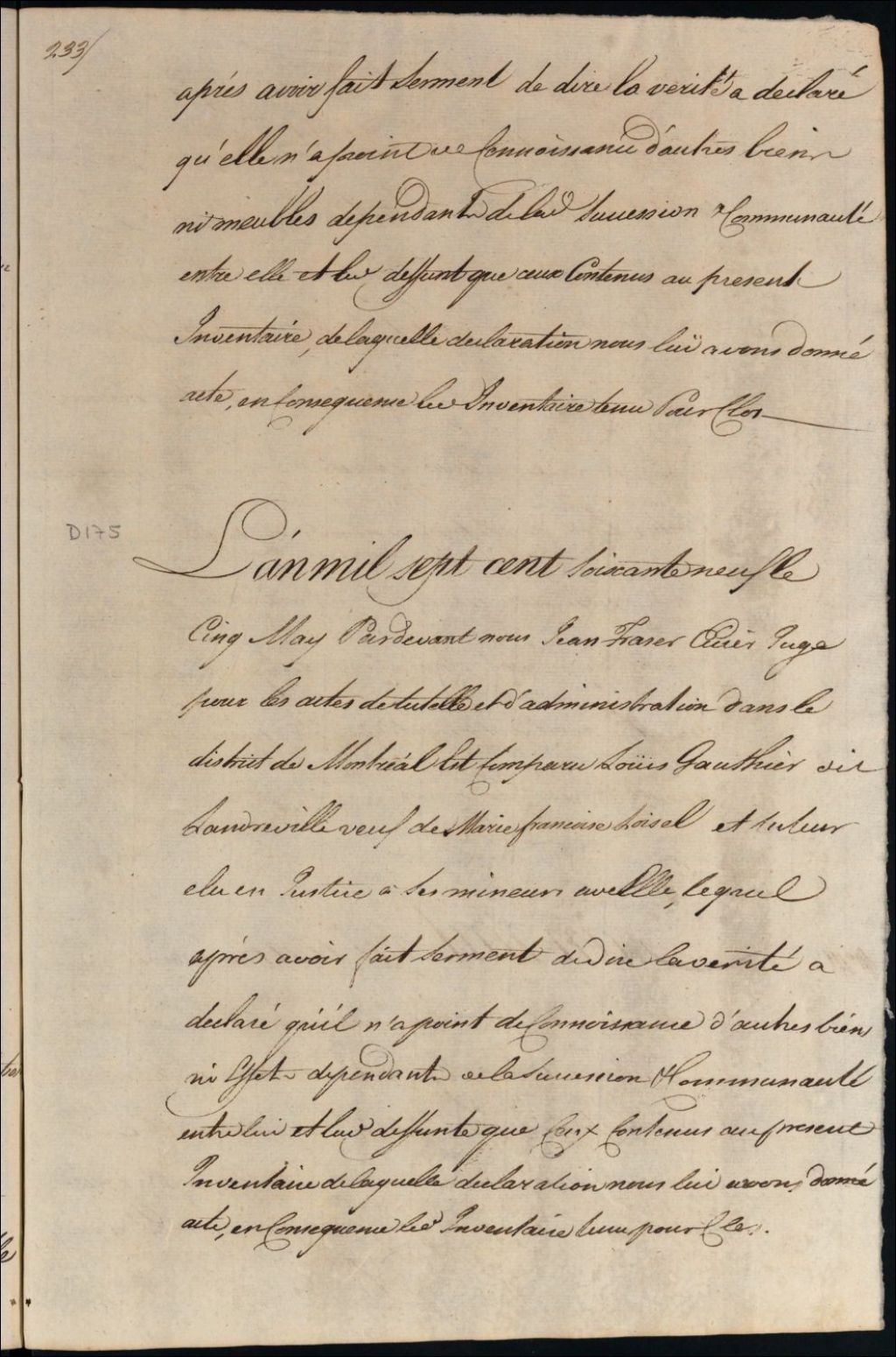 Clôture d'inventaire des biens de la succession et de la communauté de Louis Gauthier Landreville et feu Marie Françoise Loisel
