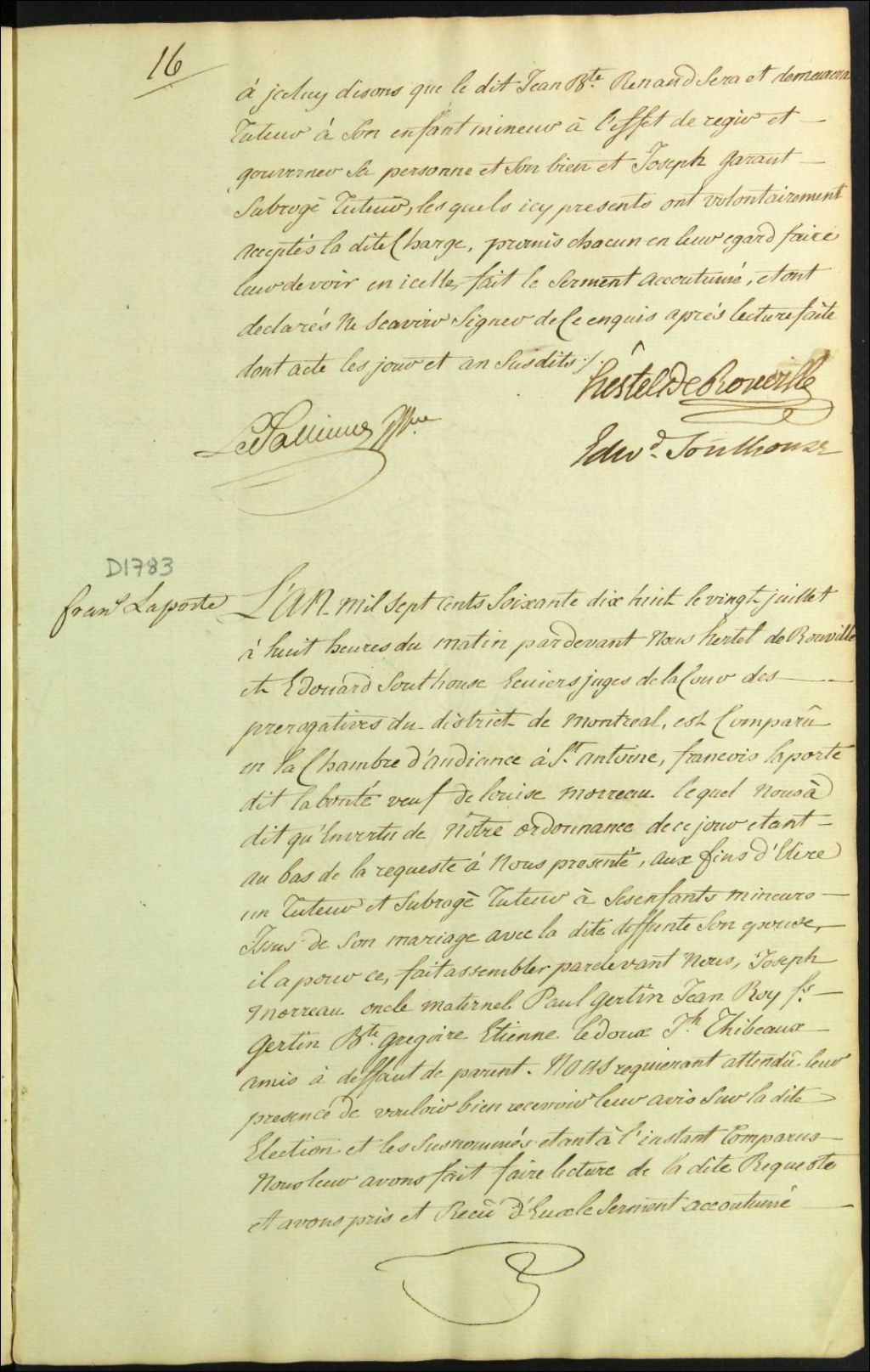 Tutelle des enfants mineurs de feu Louise Moreau et de François Laporte [Labonté], 20 juillet 1778, Archives nationales à Montréal, Fonds Cour supérieure. District judiciaire de Montréal. Procédures en matières non contentieuses, (06M,CP601,S5,D1783).