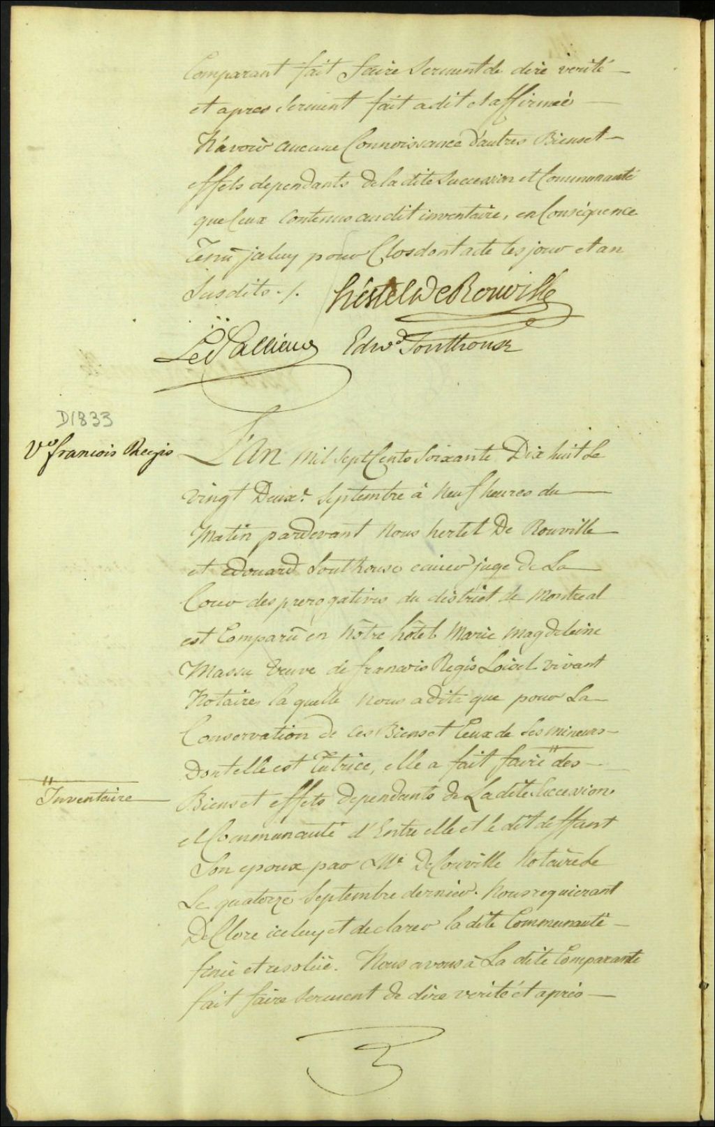 Clôture d'inventaire des biens de la succession et de la communauté de feu François Régis Loiselle et Marie Madeleine Massue, 22 septembre 1778, Archives nationales à Montréal, Fonds Cour supérieure. District judiciaire de Montréal. Procédures en matières non contentieuses, (06M,CP601,S5,D1833).