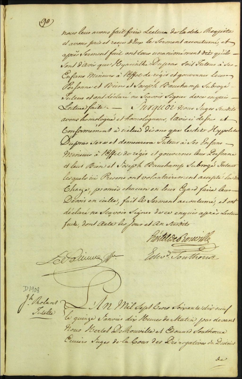 Tutelle des enfants mineurs de feu Marguerite Papin et de Joseph Rolland, 15 janvier 1779, Archives nationales à Montréal, Fonds Cour supérieure. District judiciaire de Montréal. Procédures en matières non contentieuses, (06M,CP601,S5,D1908).