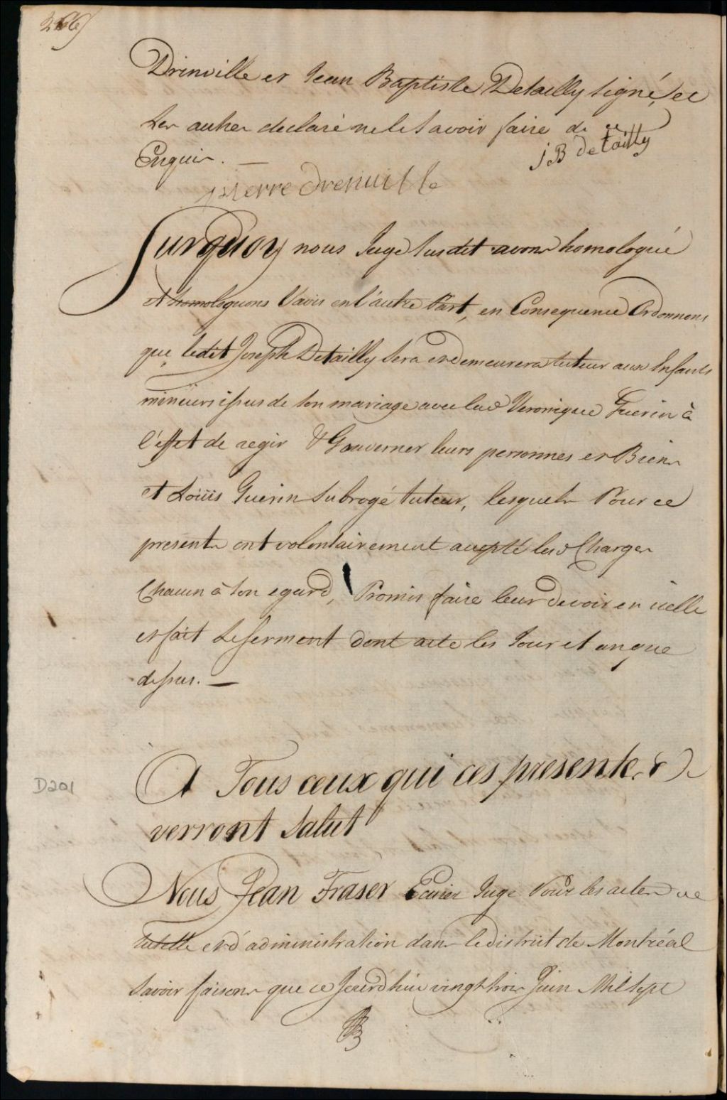 Insinuation de la donation portée au contrat de mariage entre Ambroise Rangeau Berger et Marie Josèphe Toupin, 23 juin 1769, Archives nationales à Montréal, Fonds Cour supérieure. District judiciaire de Montréal. Procédures en matières non contentieuses, (06M,CP601,S5,D201).