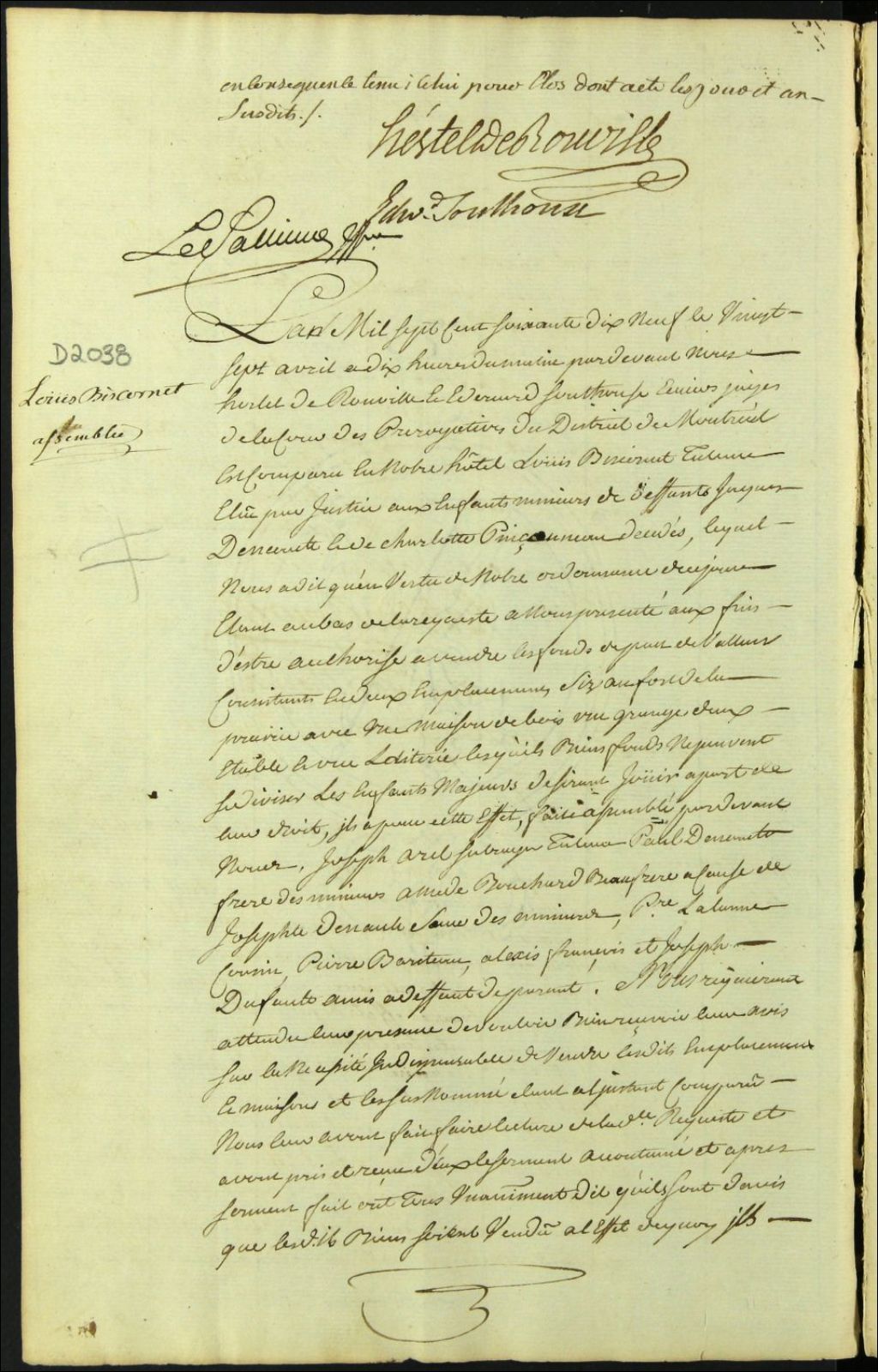 Tutelle des enfants mineurs des défunts Jacques Deneau et Charlotte Pinsonneault - Administration tutélaire, 27 avril 1779, Archives nationales à Montréal, Fonds Cour supérieure. District judiciaire de Montréal. Procédures en matières non contentieuses, (06M,CP601,S5,D2038).