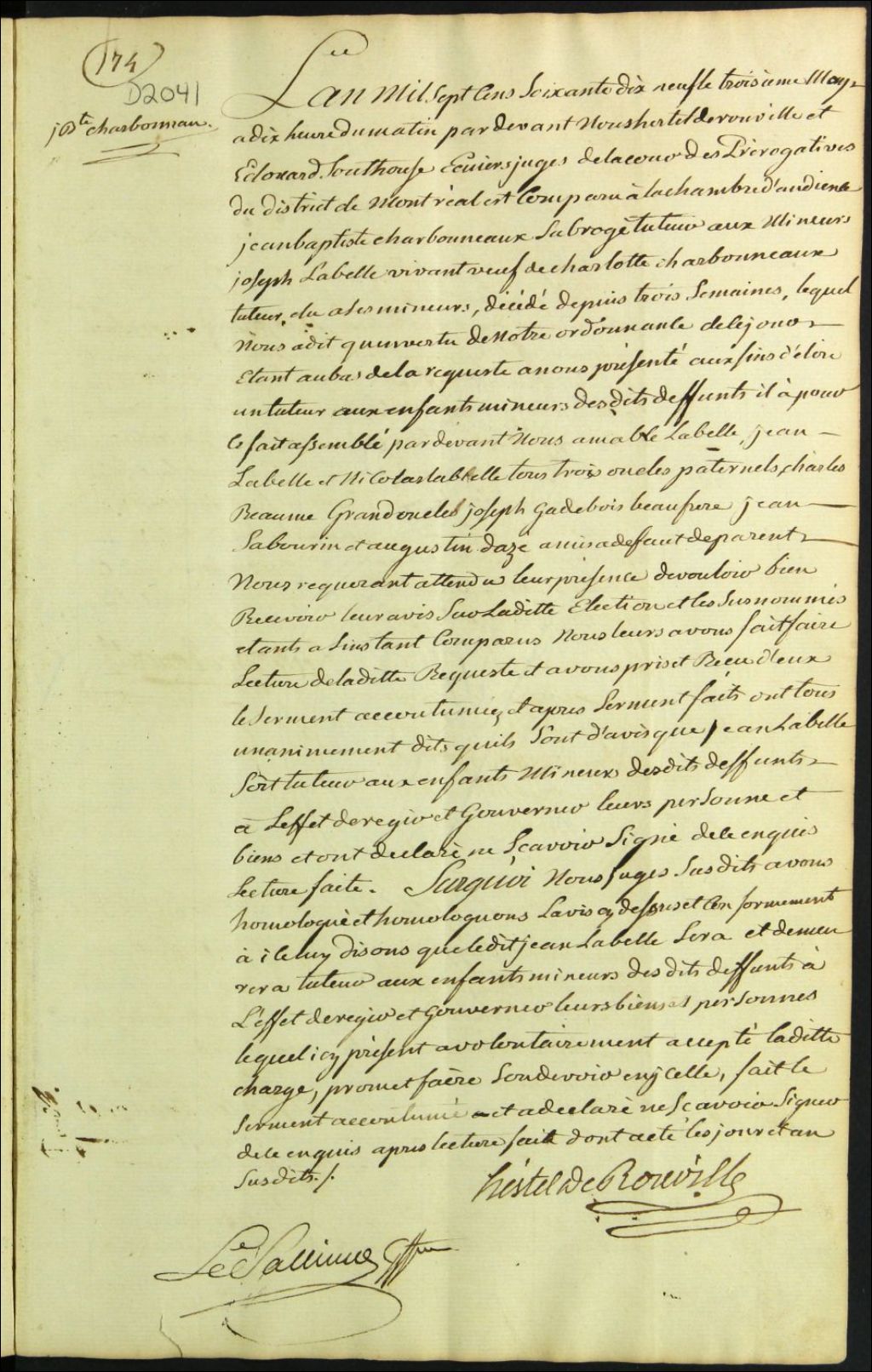 Tutelle des enfants mineurs des défunts Joseph Labelle et Charlotte Charbonneau, 3 mai 1779, Archives nationales à Montréal, Fonds Cour supérieure. District judiciaire de Montréal. Procédures en matières non contentieuses, (06M,CP601,S5,D2041).