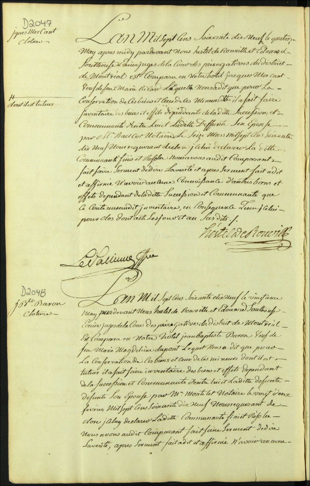 Clôture d'inventaire des biens de la succession et de la communauté de feu Marie Madeleine Dupont et Jean Baptiste Baron, 20 mai 1779, Archives nationales à Montréal, Fonds Cour supérieure. District judiciaire de Montréal. Procédures en matières non contentieuses, (06M,CP601,S5,D2048).