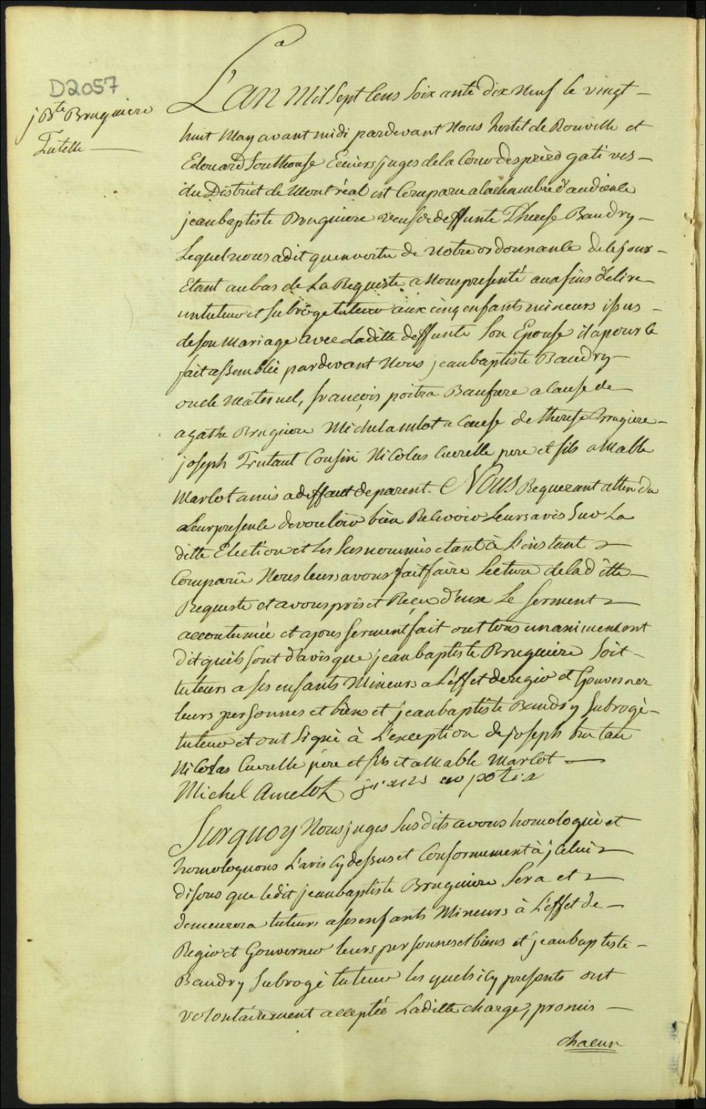 Tutelle des enfants mineurs de feu Thérèse Beaudry et Jean Baptiste Brugière, 28 mai 1779, Archives nationales à Montréal, Fonds Cour supérieure. District judiciaire de Montréal. Procédures en matières non contentieuses, (06M,CP601,S5,D2057).