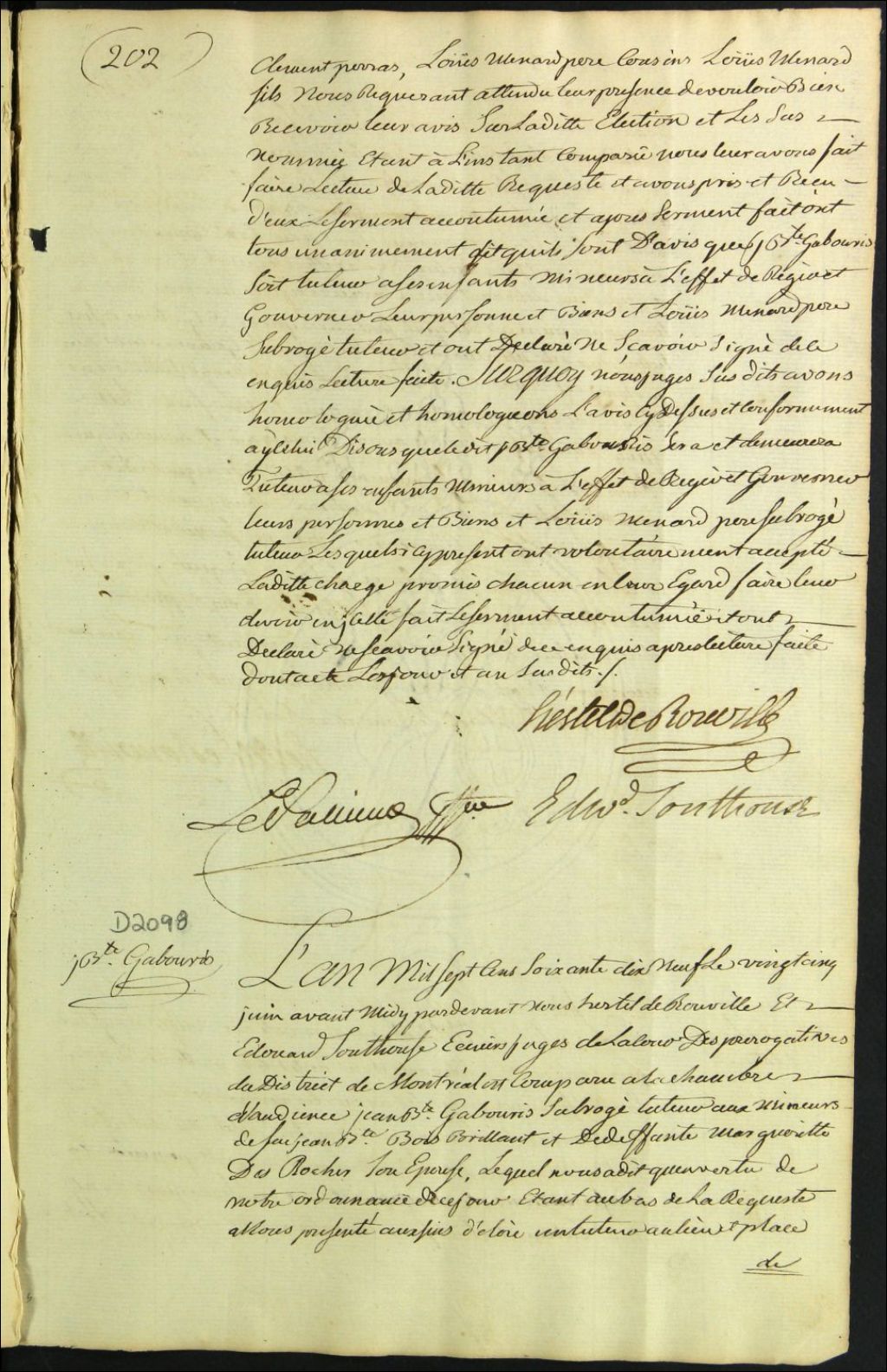 Tutelle des enfants mineurs de feu Jean Baptiste Bois Brillant Coulonge [Jean Baptiste Mabriand Coulon ?] et de défunte Marguerite Desrochers, 25 juin 1779, Archives nationales à Montréal, Fonds Cour supérieure. District judiciaire de Montréal. Procédures en matières non contentieuses, (06M,CP601,S5,D2098).