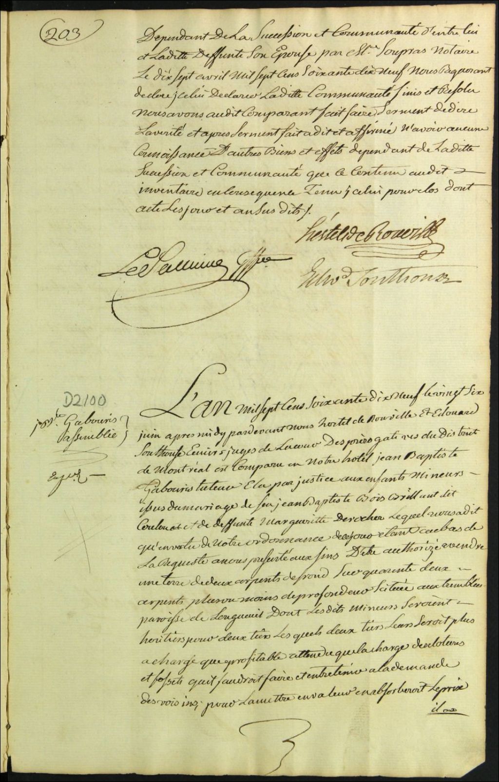 Tutelle des enfants mineurs de feu Jean Baptiste Bois Brillant Coulon [Jean Baptiste Mabriand Coulon ?] et de défunte Marguerite Desrochers - Administration tutélaire, 26 juin 1779, Archives nationales à Montréal, Fonds Cour supérieure. District judiciaire de Montréal. Procédures en matières non contentieuses, (06M,CP601,S5,D2100).