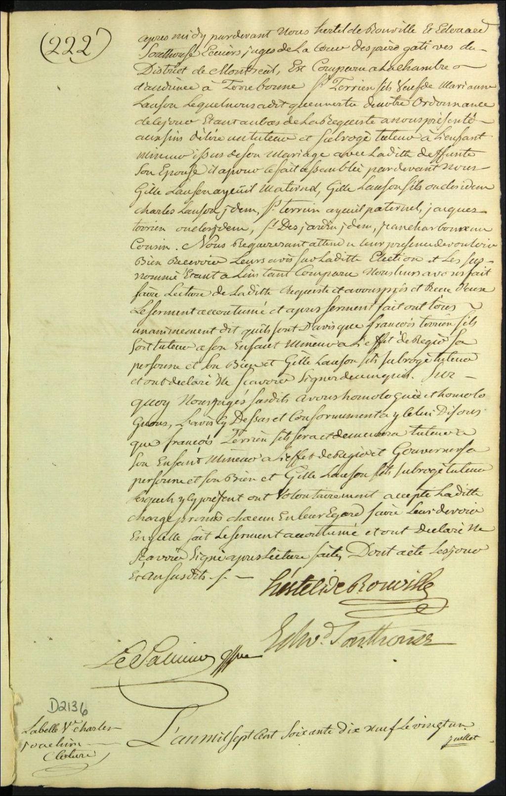 Clôture d'inventaire des biens de la succession et de la communauté de feu Charles Joachim Labelle et Marie Josèphe Masson, 21 juillet 1779, Archives nationales à Montréal, Fonds Cour supérieure. District judiciaire de Montréal. Procédures en matières non contentieuses, (06M,CP601,S5,D2136).