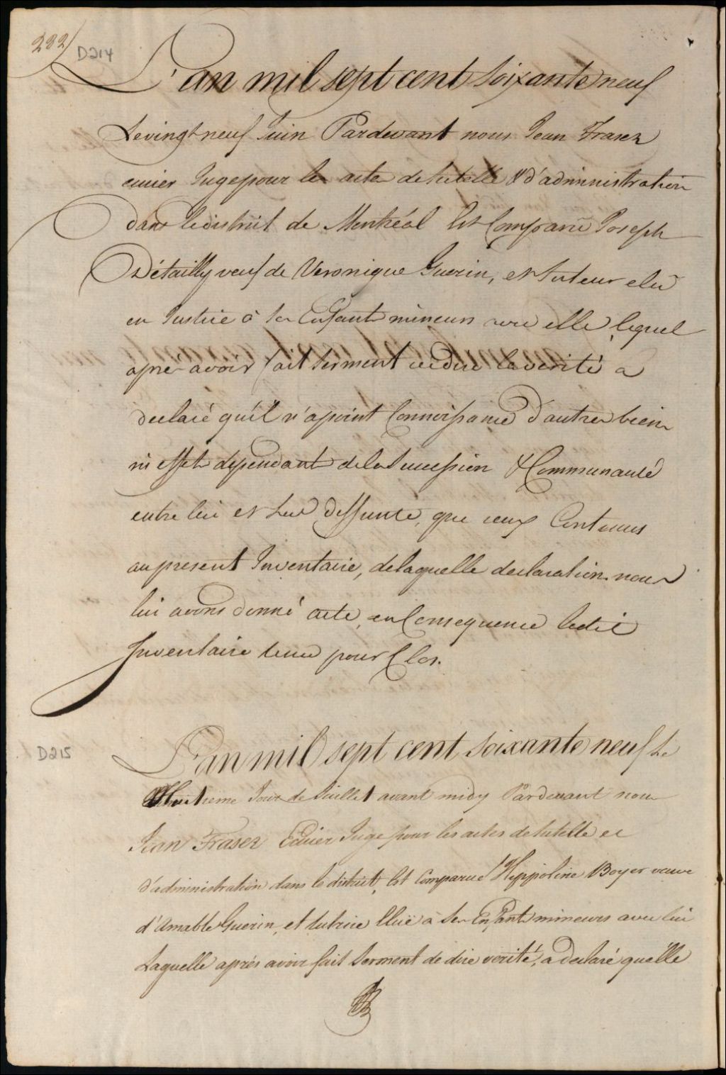 Clôture d'inventaire des biens de la succession et de la communauté de Hippoline Boyer [Marie Hippolyte Boyer] et feu Amable Guérin, 28 juin 1769, Archives nationales à Montréal, Fonds Cour supérieure. District judiciaire de Montréal. Procédures en matières non contentieuses, (06M,CP601,S5,D215).