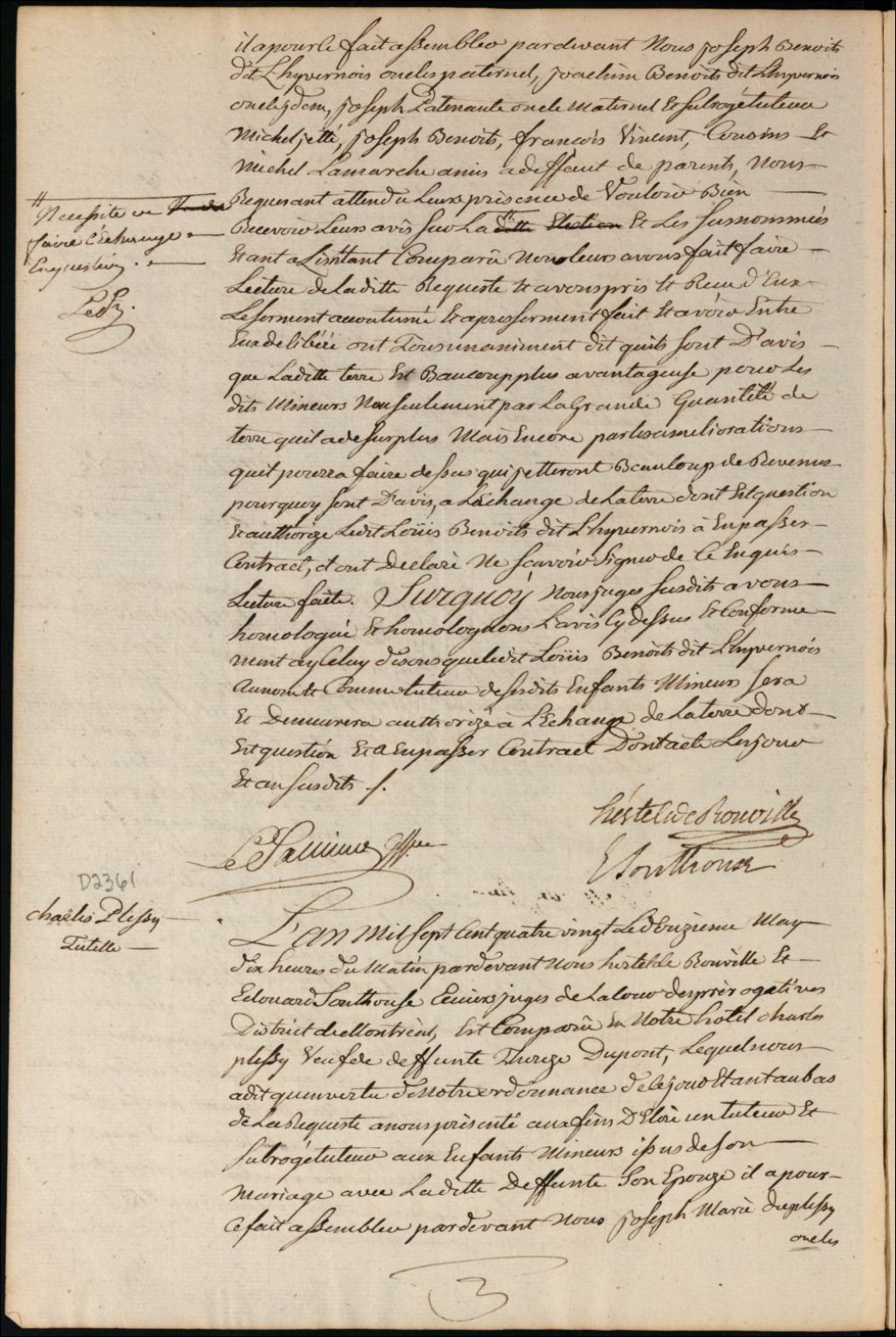 Tutelle des enfants mineurs de feu Thérèse Dupont et de Charles Plessy [Charles Duplessis], 12 mai 1780, Archives nationales à Montréal, Fonds Cour supérieure. District judiciaire de Montréal. Procédures en matières non contentieuses, (06M,CP601,S5,D2361).