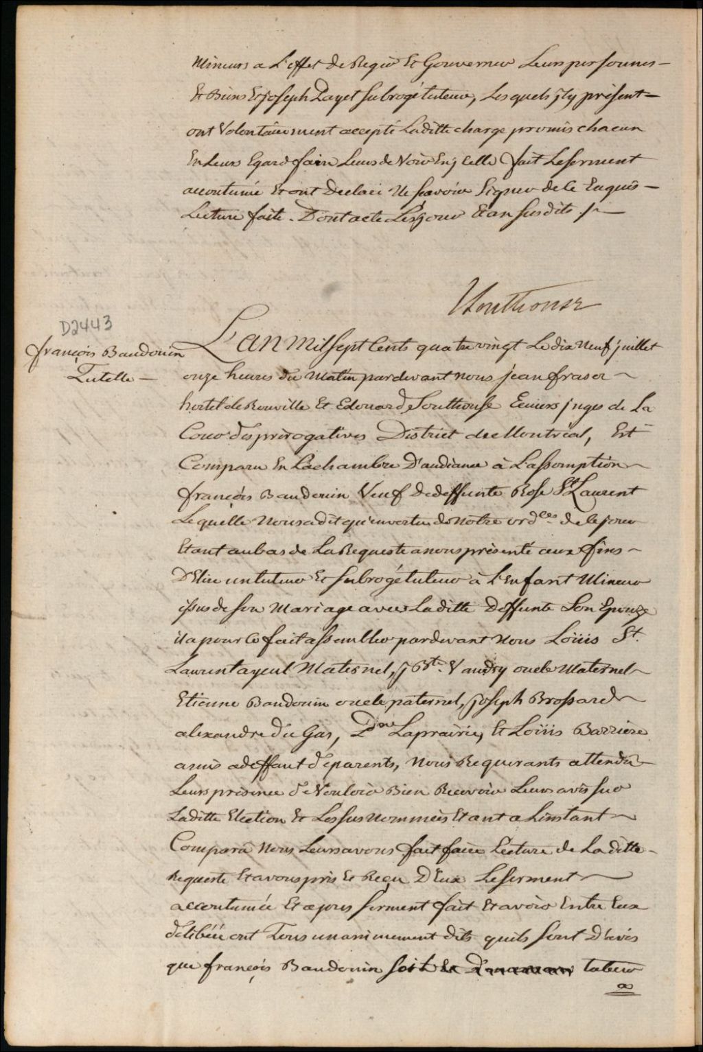 Tutelle de l'enfant mineur de feu Rose Saint-Laurent et de François Baudouin, 19 juillet 1780, Archives nationales à Montréal, Fonds Cour supérieure. District judiciaire de Montréal. Procédures en matières non contentieuses, (06M,CP601,S5,D2443).
