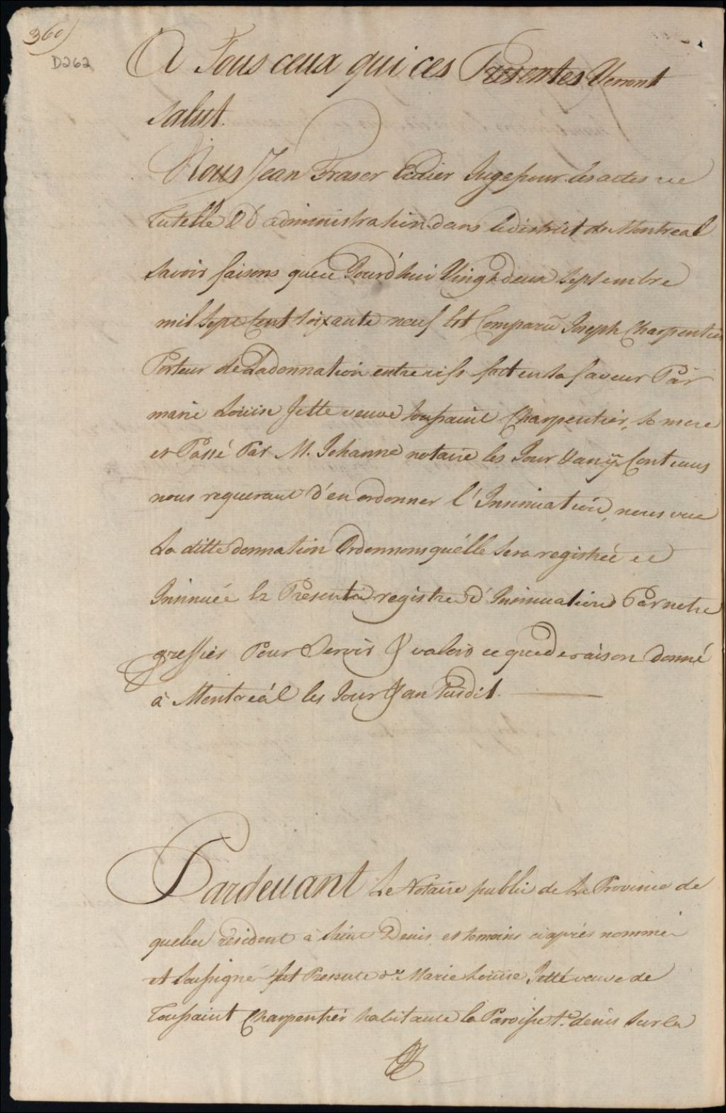 Insinuation de la donation de Marie Louise Jetté, veuve de Toussaint Charpentier, à son fils Joseph Charpentier