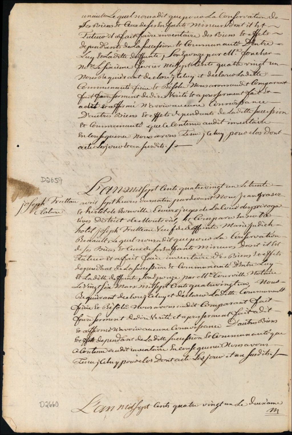 Clôture d'inventaire des biens de la succession et de la communauté de feu Marguerite Dandonneau et François Valois, 2 mai 1781, Archives nationales à Montréal, Fonds Cour supérieure. District judiciaire de Montréal. Procédures en matières non contentieuses, (06M,CP601,S5,D2660).