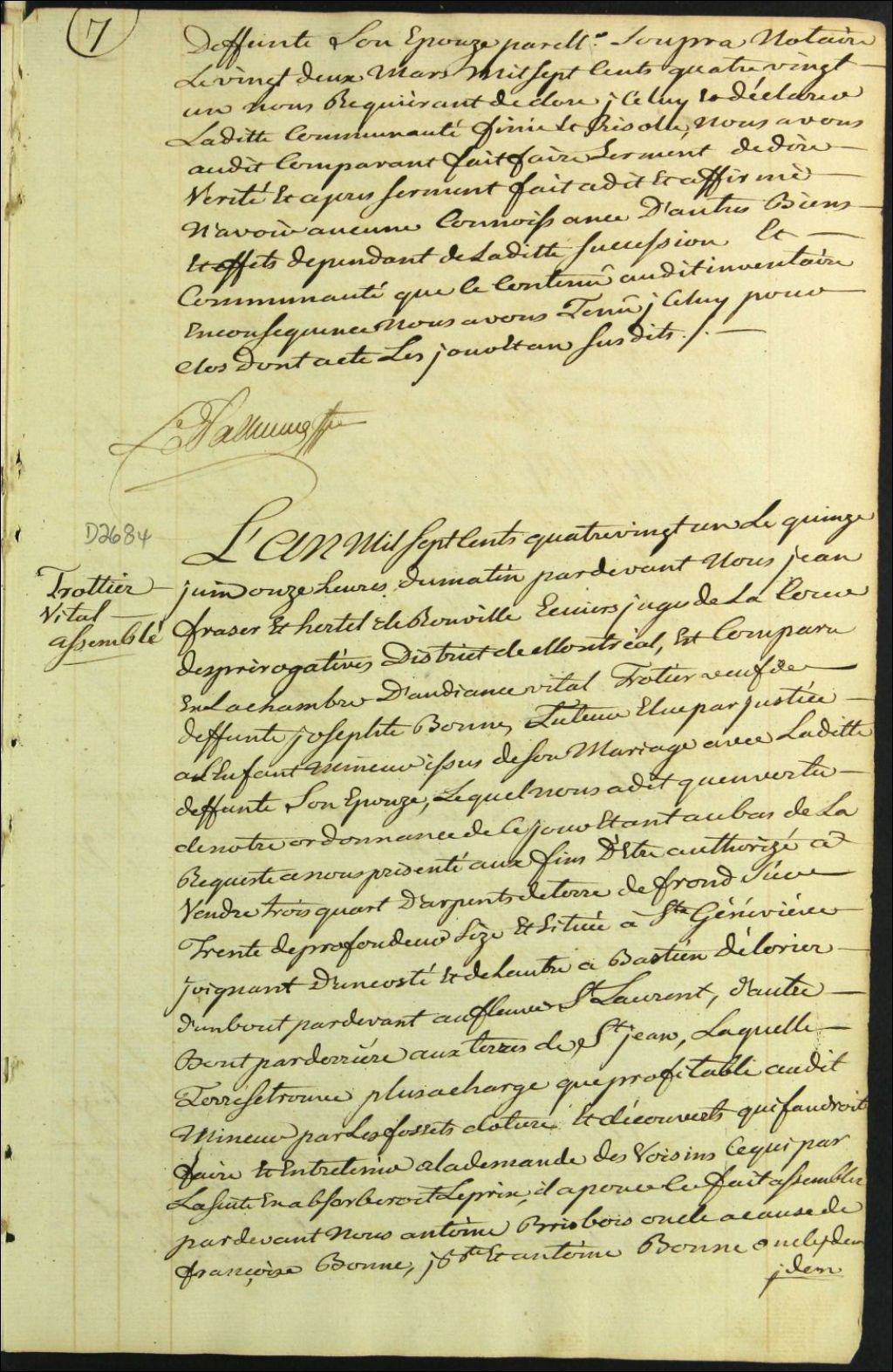 Tutelle des enfants mineurs de feu Josèphe Bonne [Josèphe Baune] et Vital Trottier - Administration tutélaire, 15 juin 1781, Archives nationales à Montréal, Fonds Cour supérieure. District judiciaire de Montréal. Procédures en matières non contentieuses, (06M,CP601,S5,D2684).