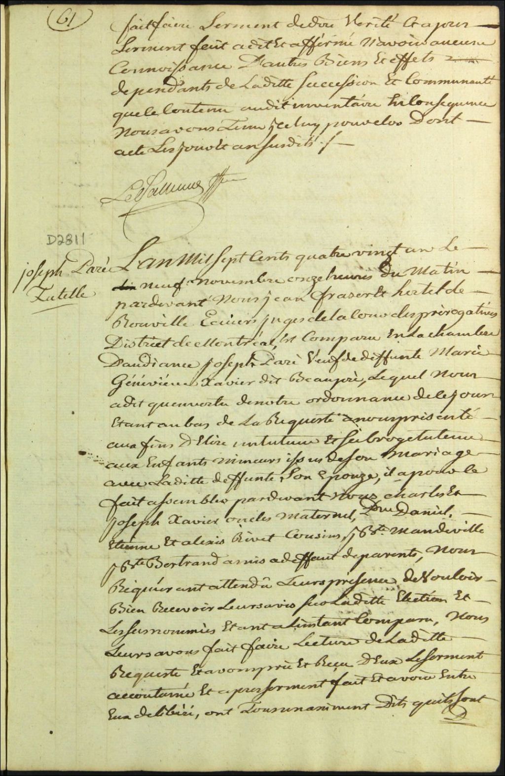 Tutelle des enfants mineurs de feu Marie Geneviève Xavier Beaupré et Joseph Paré, 9 novembre 1781, Archives nationales à Montréal, Fonds Cour supérieure. District judiciaire de Montréal. Procédures en matières non contentieuses, (06M,CP601,S5,D2811).