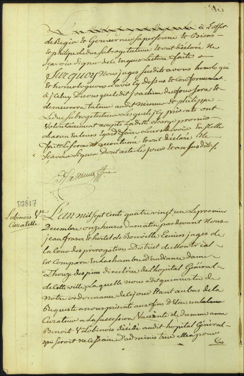 Curatelle de la succession vacante d'Anne Benoît, veuve [Louis Jean] Lobinois, 1 décembre 1781, Archives nationales à Montréal, Fonds Cour supérieure. District judiciaire de Montréal. Procédures en matières non contentieuses, (06M,CP601,S5,D2817).