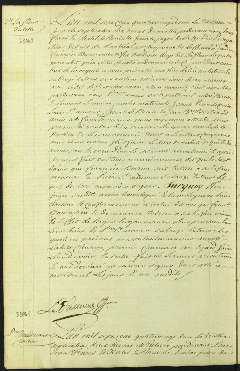 Clôture d'inventaire des biens de la succession et de la communauté de feu Marguerite Landry et Pierre Boudreau, 30 septembre 1782, Archives nationales à Montréal, Fonds Cour supérieure. District judiciaire de Montréal. Procédures en matières non contentieuses, (06M,CP601,S5,D3061).