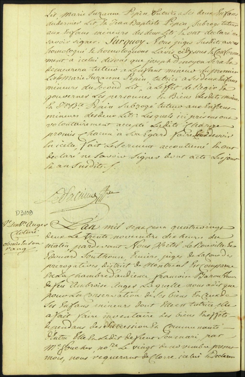 Clôture d'inventaire des biens de la succession et de la communauté de feu Ambroise Auger et Françoise Baron, 30 novembre 1782, Archives nationales à Montréal, Fonds Cour supérieure. District judiciaire de Montréal. Procédures en matières non contentieuses, (06M,CP601,S5,D3108).