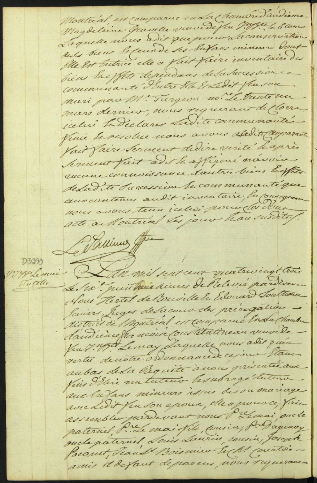 Tutelle des enfants mineurs de feu Jean Baptiste Lemay et Françoise Constantineau, 6 juin 1783, Archives nationales à Montréal, Fonds Cour supérieure. District judiciaire de Montréal. Procédures en matières non contentieuses, (06M,CP601,S5,D3290).