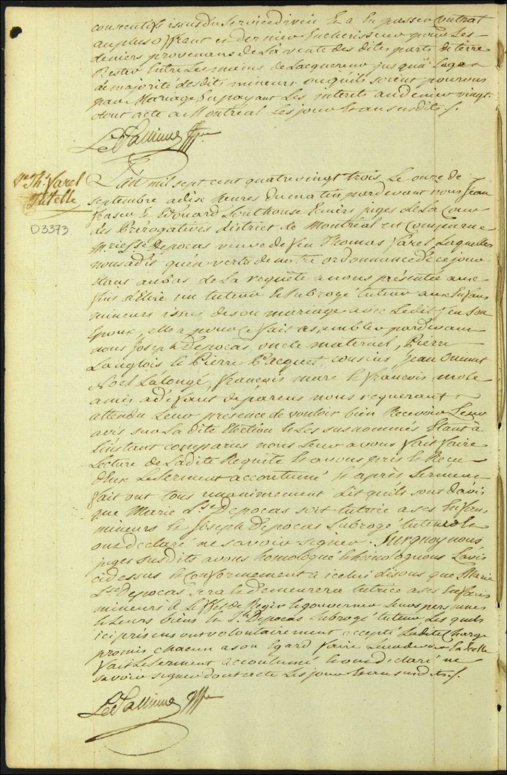 Tutelle des enfants mineurs de feu Thomas Farel [Thomas Farrell]et Marie Louise Depaucas, 11 septembre 1783, Archives nationales à Montréal, Fonds Cour supérieure. District judiciaire de Montréal. Procédures en matières non contentieuses, (06M,CP601,S5,D3373).