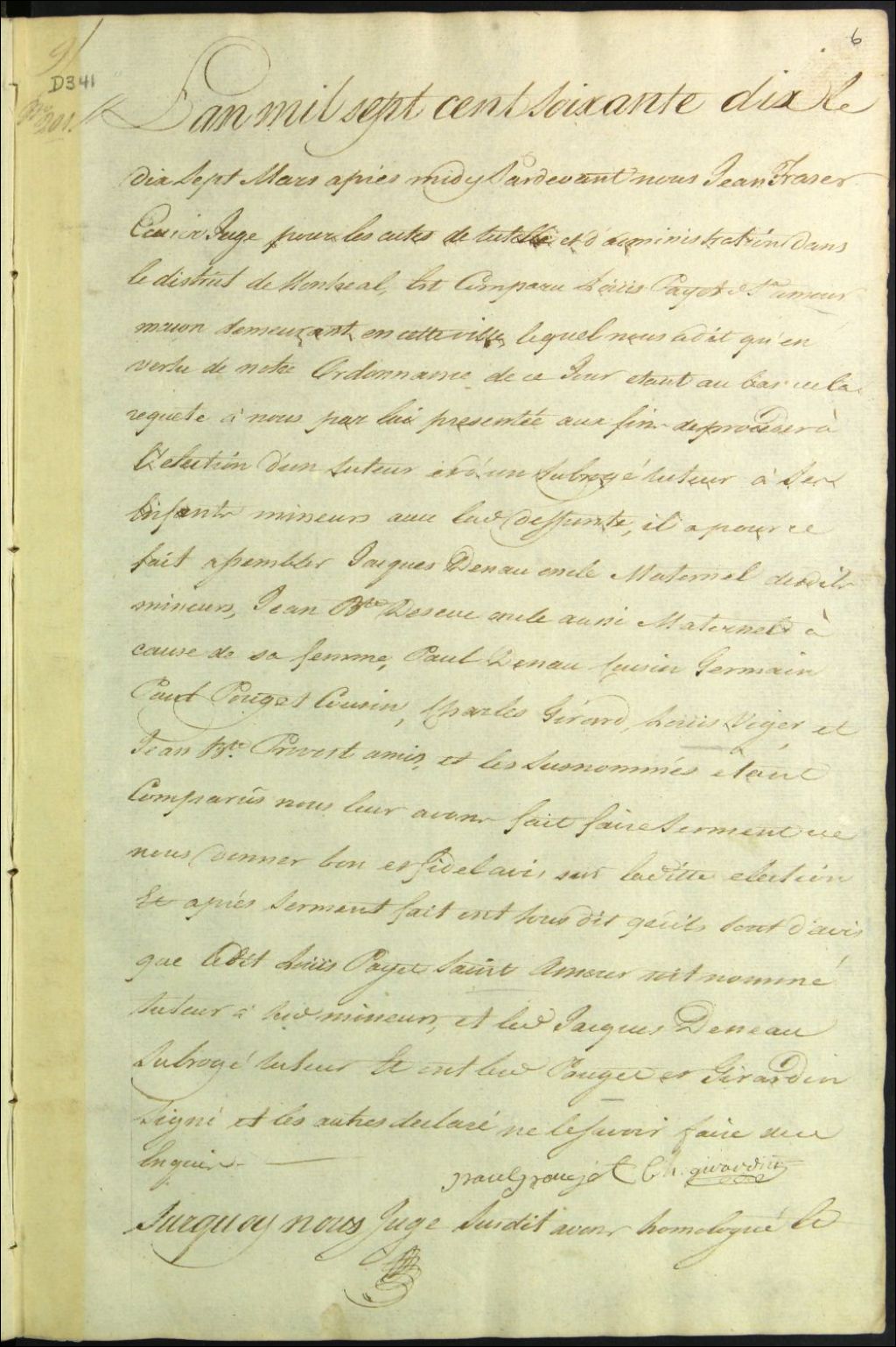 Tutelle des enfants mineurs de feu [Marie Anne Deneau Detailly] et de Louis Payet Saint-Amour, 17 mars 1770, Archives nationales à Montréal, Fonds Cour supérieure. District judiciaire de Montréal. Procédures en matières non contentieuses, (06M,CP601,S5,D341).