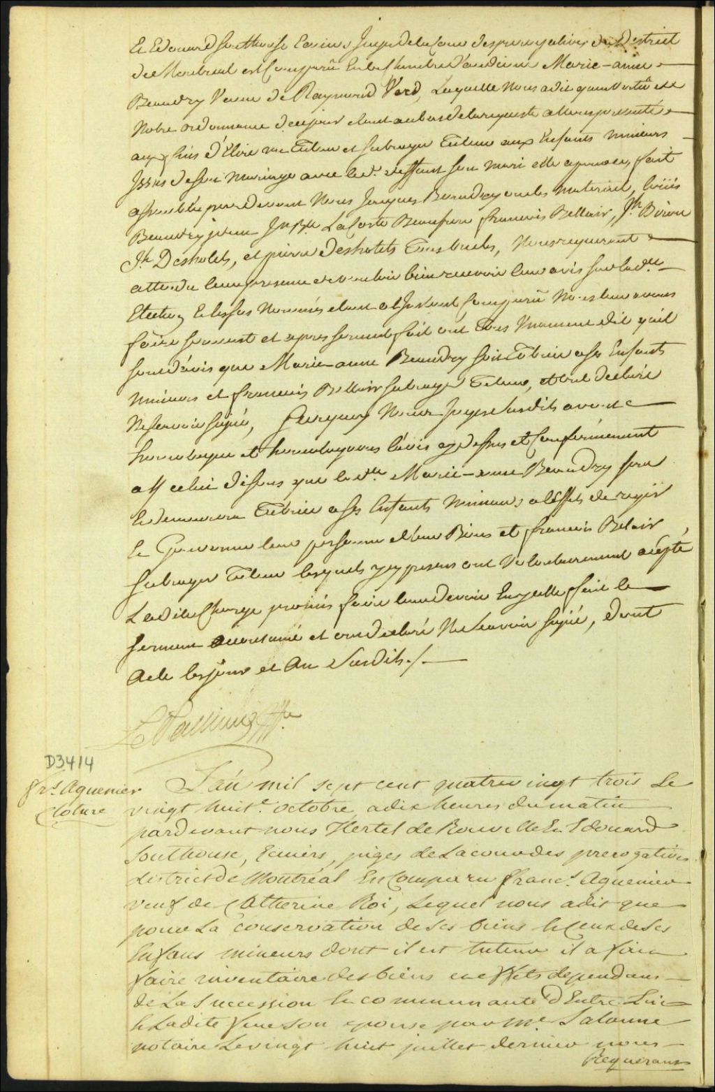 Clôture d'inventaire des biens de la succession et de la communauté de feu Catherine Roy et François [H]aguenier, 28 octobre 1783, Archives nationales à Montréal, Fonds Cour supérieure. District judiciaire de Montréal. Procédures en matières non contentieuses, (06M,CP601,S5,D3414).