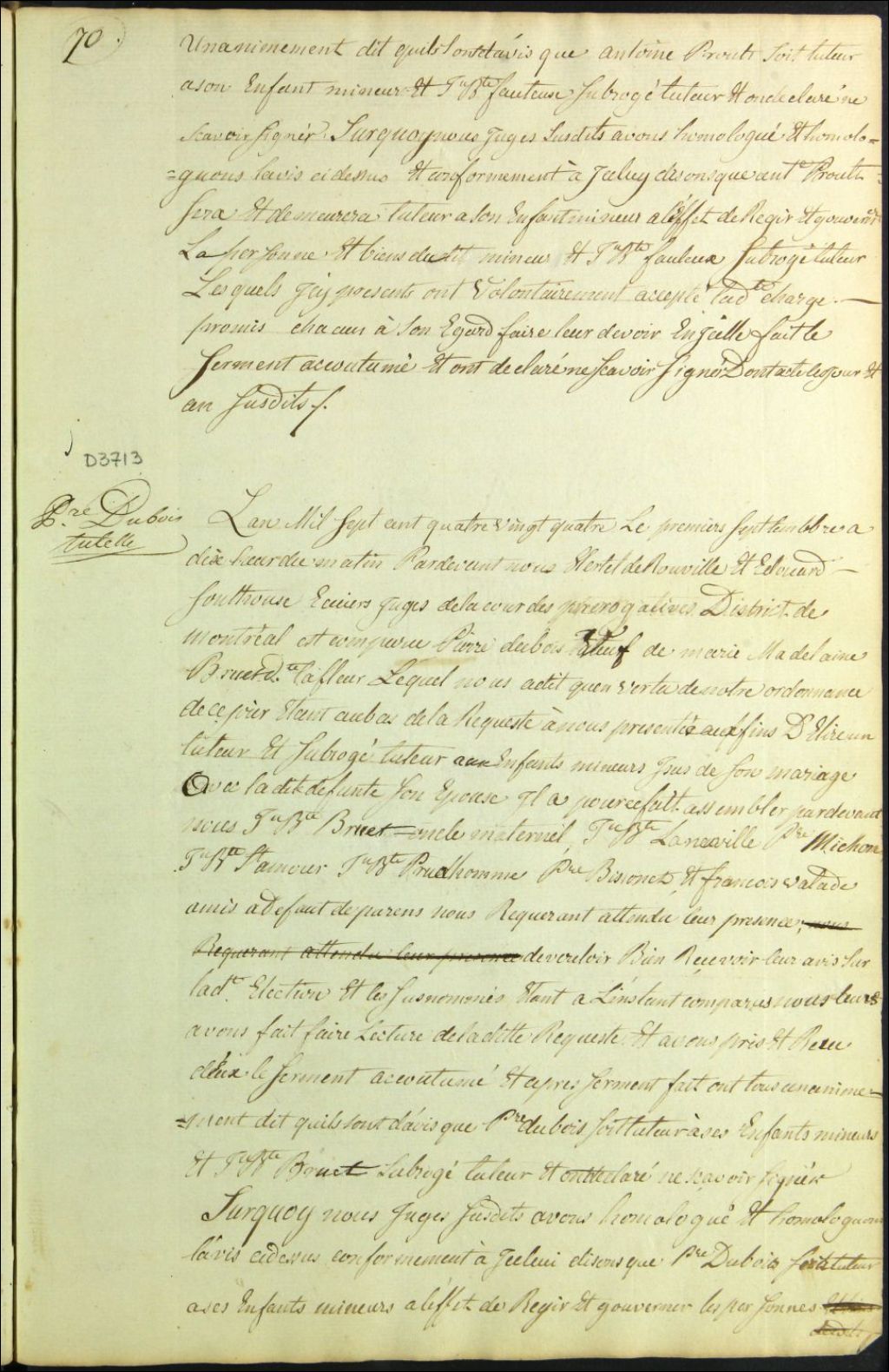 Tutelle des enfants mineurs de feu Marie Madeleine Bruet Lafleur [Marie Madeleine Gruet Lafleur] et de Pierre Dubois, 1 septembre 1784, Archives nationales à Montréal, Fonds Cour supérieure. District judiciaire de Montréal. Procédures en matières non contentieuses, (06M,CP601,S5,D3713).