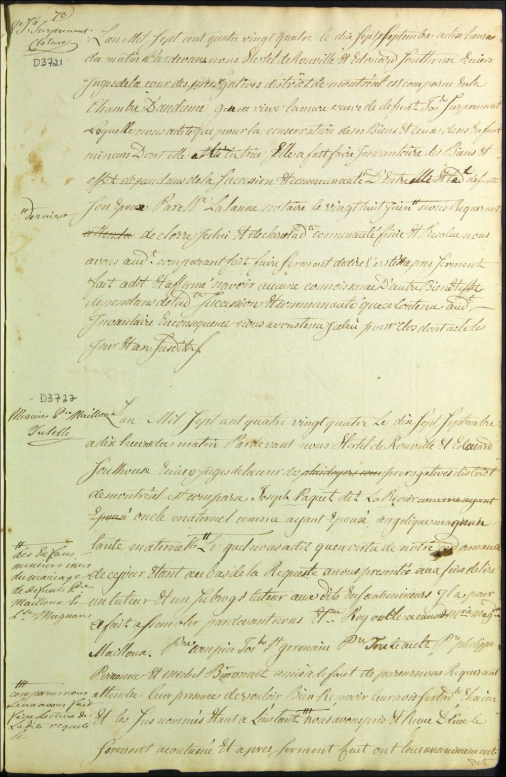Tutelle des enfants mineurs des défunts Pierre Mailloux et Louise Magnan, 17 septembre 1784, Archives nationales à Montréal, Fonds Cour supérieure. District judiciaire de Montréal. Procédures en matières non contentieuses, (06M,CP601,S5,D3722).