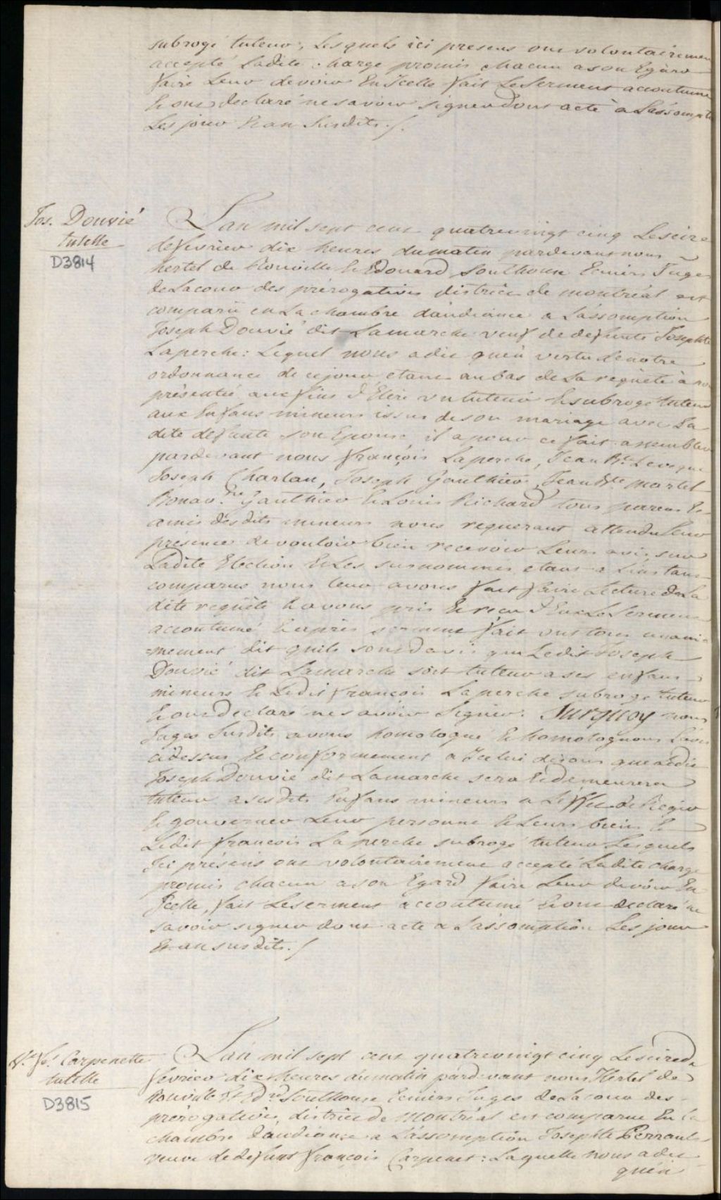 Tutelle de l'enfant mineur de feu François Carpenet et de Josèphe Perrault, 16 février 1785, Archives nationales à Montréal, Fonds Cour supérieure. District judiciaire de Montréal. Procédures en matières non contentieuses, (06M,CP601,S5,D3815).