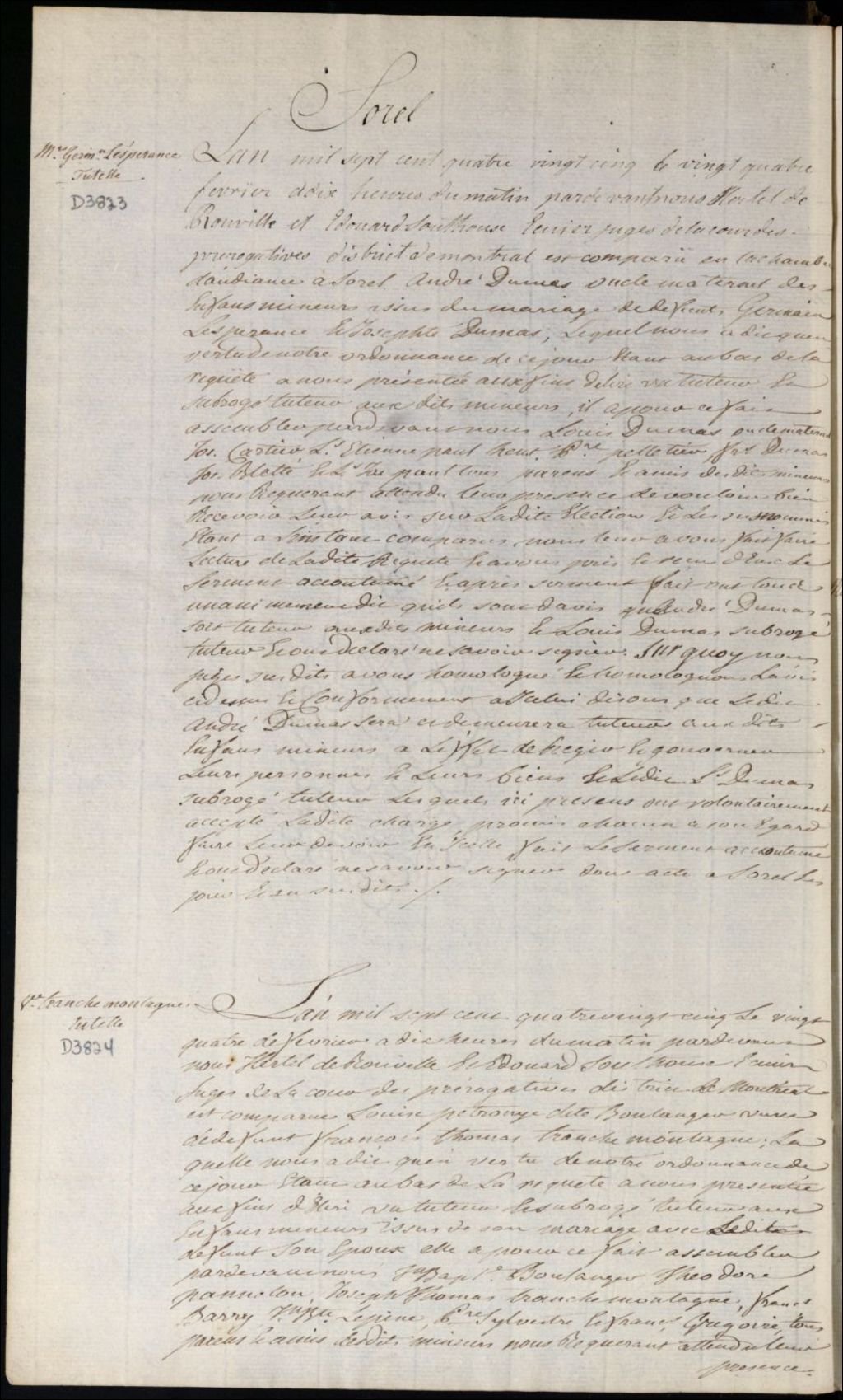 Tutelle des enfants mineurs de feu François Thomas Tranchemontagne et de Louise Pétronye Boulanger [Louise Pétronille Boulanger], 24 février 1785, Archives nationales à Montréal, Fonds Cour supérieure. District judiciaire de Montréal. Procédures en matières non contentieuses, (06M,CP601,S5,D3824).