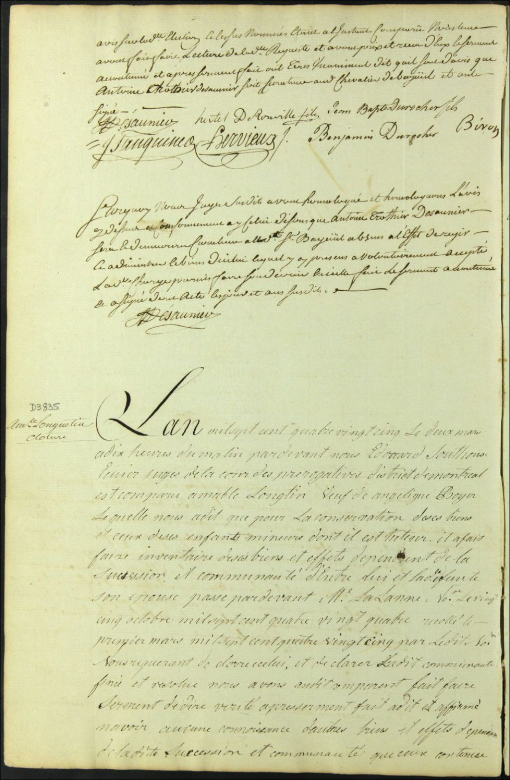 Clôture d'inventaire des biens de la succession et de la communauté de feu Angélique Boyer et Amable Longtin, 2 mars 1785, Archives nationales à Montréal, Fonds Cour supérieure. District judiciaire de Montréal. Procédures en matières non contentieuses, (06M,CP601,S5,D3835).