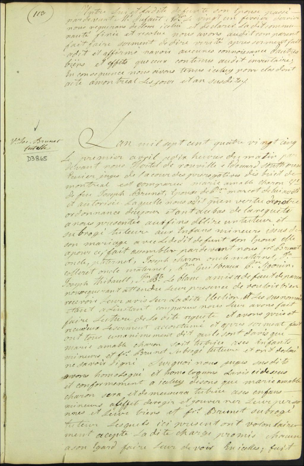 Tutelle des enfants mineurs de feu Joseph Brunet et de Marie Amable Charon, 1 avril 1785, Archives nationales à Montréal, Fonds Cour supérieure. District judiciaire de Montréal. Procédures en matières non contentieuses, (06M,CP601,S5,D3865).
