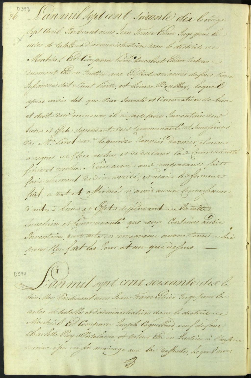 Clôture d'inventaire des biens de la succession et de la communauté de feu Charlotte Roy Portelance et Joseph Coquillard [Joseph Cérat Coquillard], 3 mai 1770, Archives nationales à Montréal, Fonds Cour supérieure. District judiciaire de Montréal. Procédures en matières non contentieuses, (06M,CP601,S5,D394).