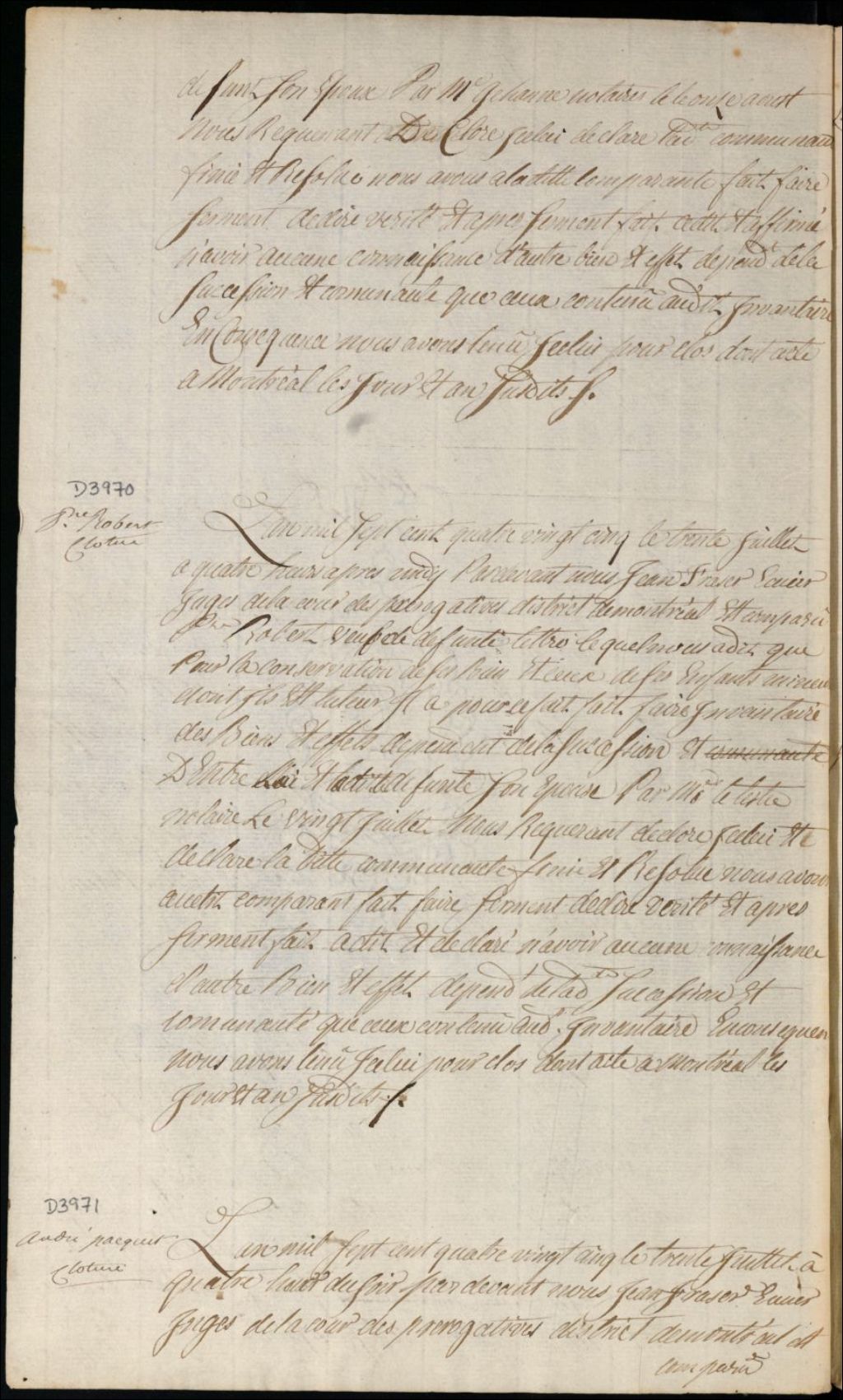 Clôture d'inventaire des biens de la succession et de la communauté de feu Agathe Coitou [Saint-Jean] et André Paquet Vallée, 30 juillet 1785, Archives nationales à Montréal, Fonds Cour supérieure. District judiciaire de Montréal. Procédures en matières non contentieuses, (06M,CP601,S5,D3971).