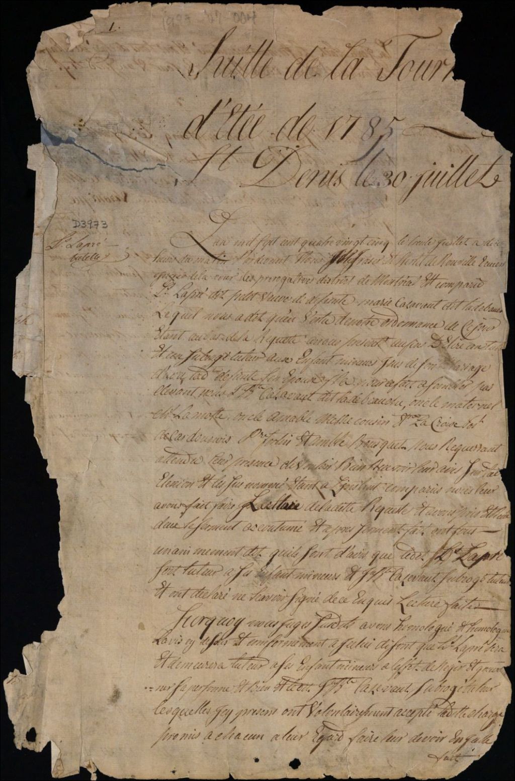 Tutelle des enfants mineurs de feu Marie Casavant Ladébauche et de Louis Lapré Petit, 30 juillet 1785, Archives nationales à Montréal, Fonds Cour supérieure. District judiciaire de Montréal. Procédures en matières non contentieuses, (06M,CP601,S5,D3973).