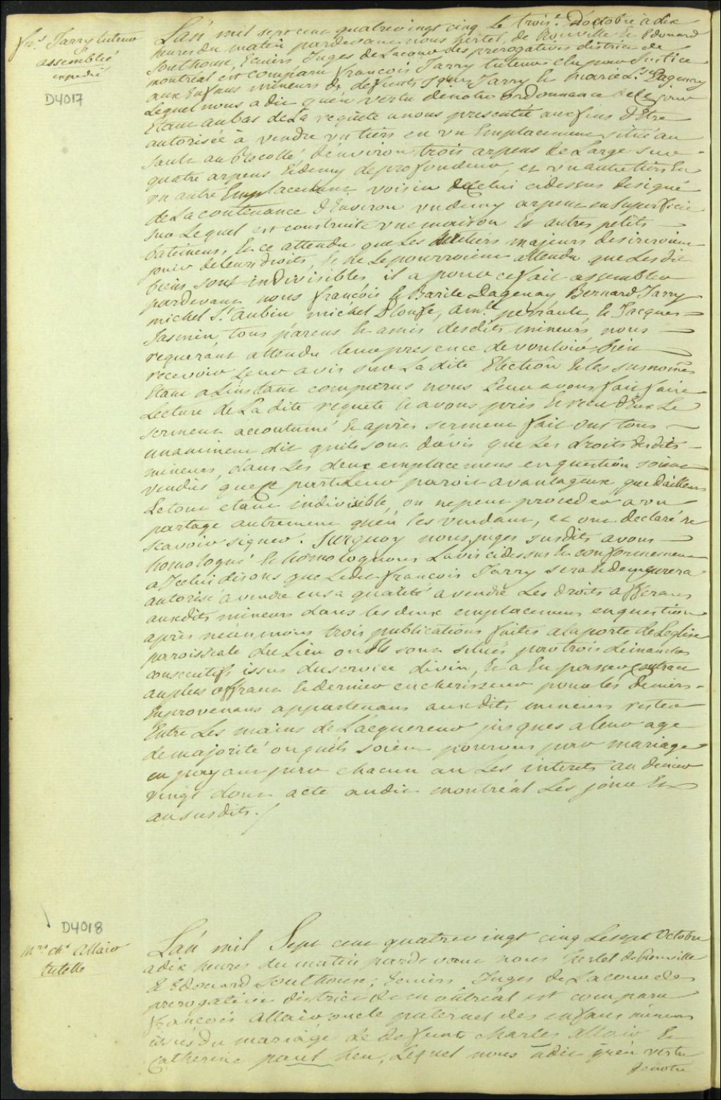 Tutelle des enfants mineurs des défunts Charles Allaire et Catherine Paul [Hus], 7 octobre 1785, Archives nationales à Montréal, Fonds Cour supérieure. District judiciaire de Montréal. Procédures en matières non contentieuses, (06M,CP601,S5,D4018).