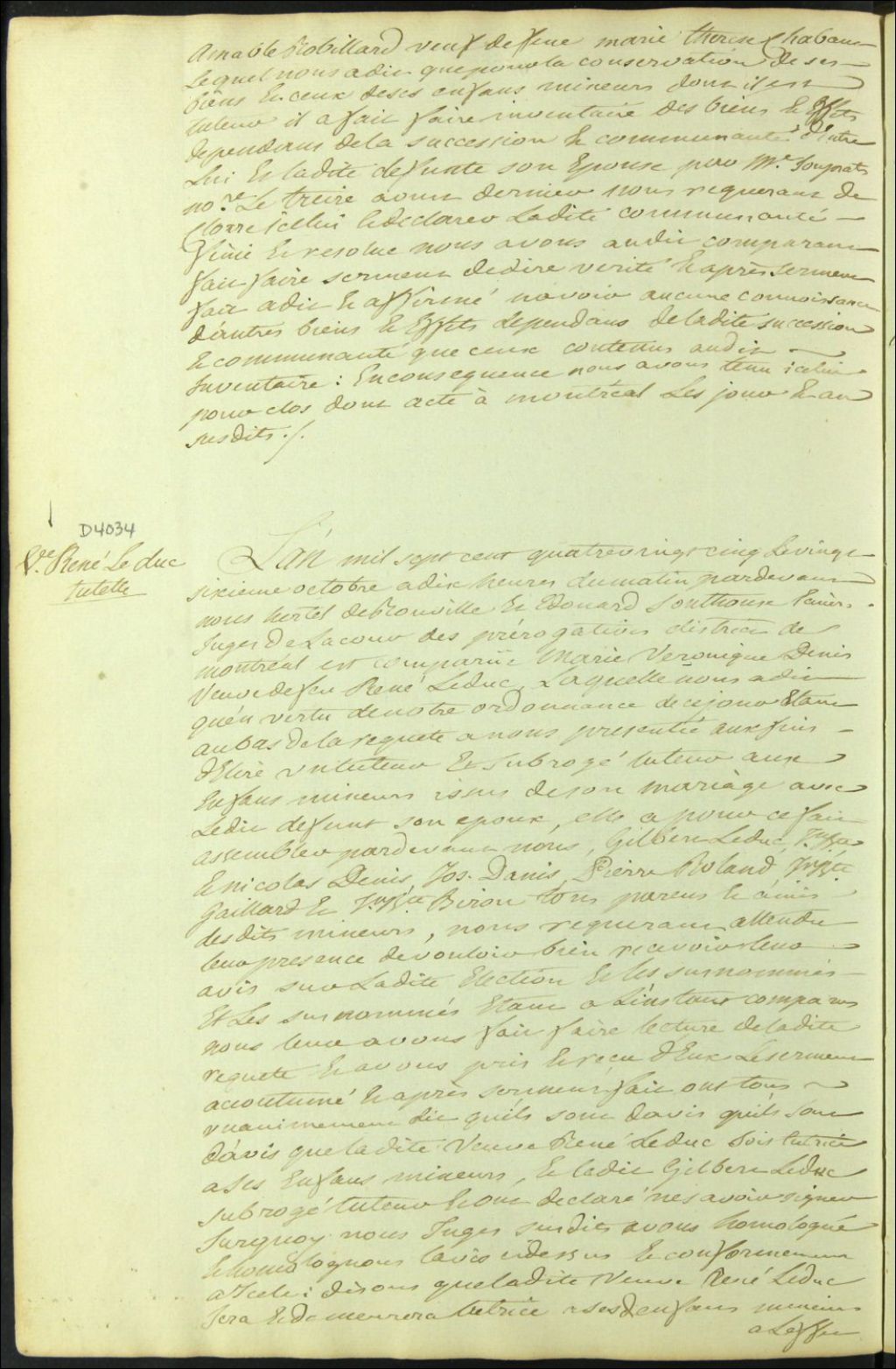 Tutelle des enfants mineurs de feu René Leduc et de Marie Véronique Denis, 26 octobre 1785, Archives nationales à Montréal, Fonds Cour supérieure. District judiciaire de Montréal. Procédures en matières non contentieuses, (06M,CP601,S5,D4034).