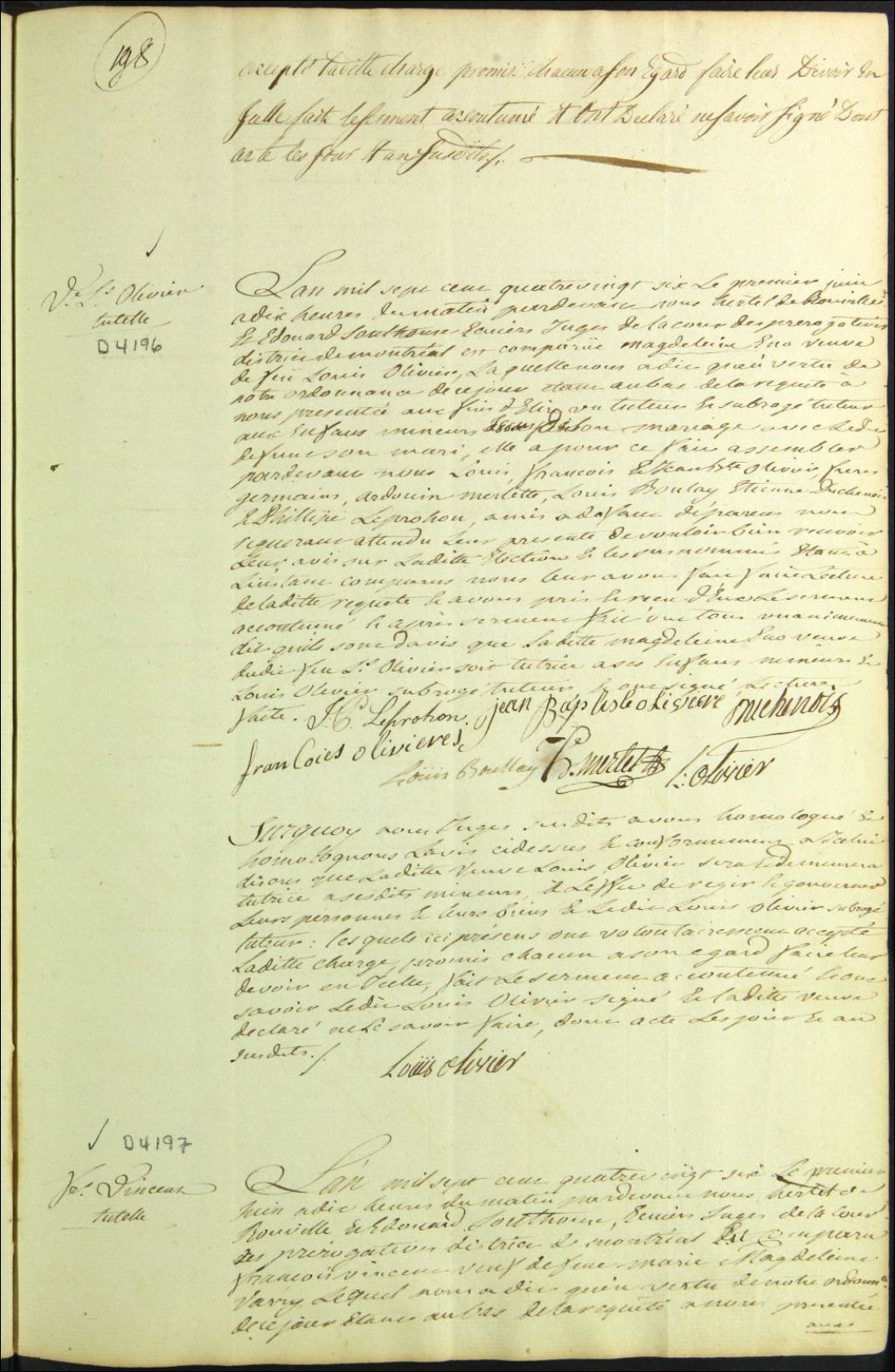 Tutelle des enfants mineurs de feu Louis Olivier et de Madeleine [Hénault], 1 juin 1786, Archives nationales à Montréal, Fonds Cour supérieure. District judiciaire de Montréal. Procédures en matières non contentieuses, (06M,CP601,S5,D4196).