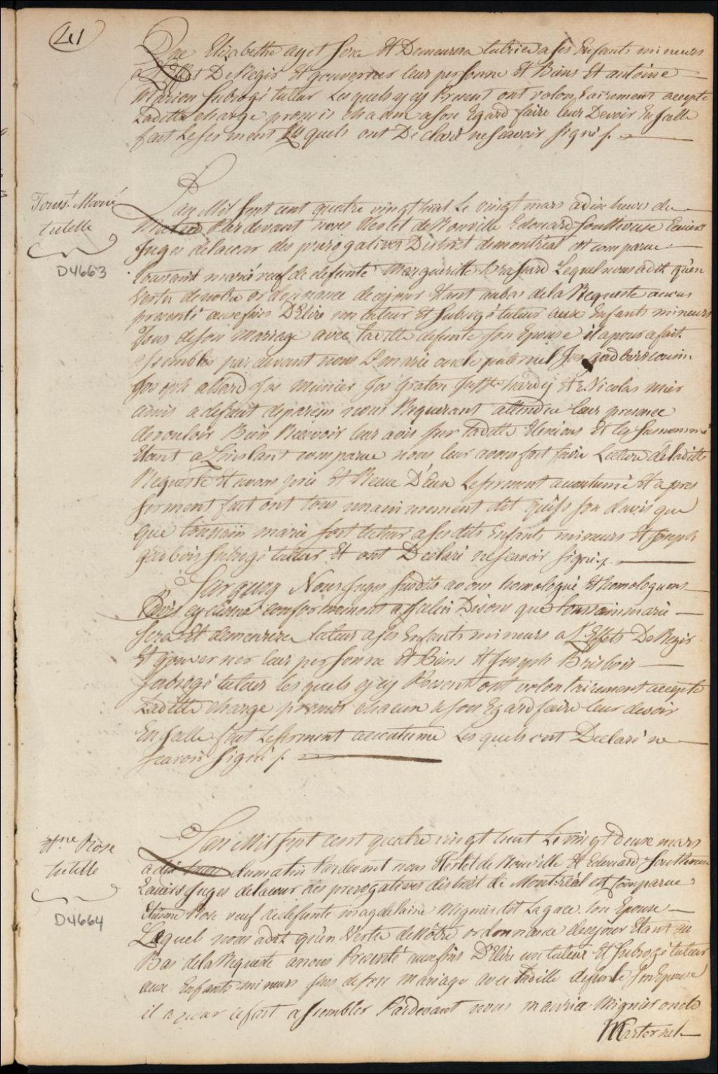 Tutelle des enfants mineurs de feu Marguerite Brassard et Toussaint Marie[r], 20 mars 1788, Archives nationales à Montréal, Fonds Cour supérieure. District judiciaire de Montréal. Procédures en matières non contentieuses, (06M,CP601,S5,D4663).