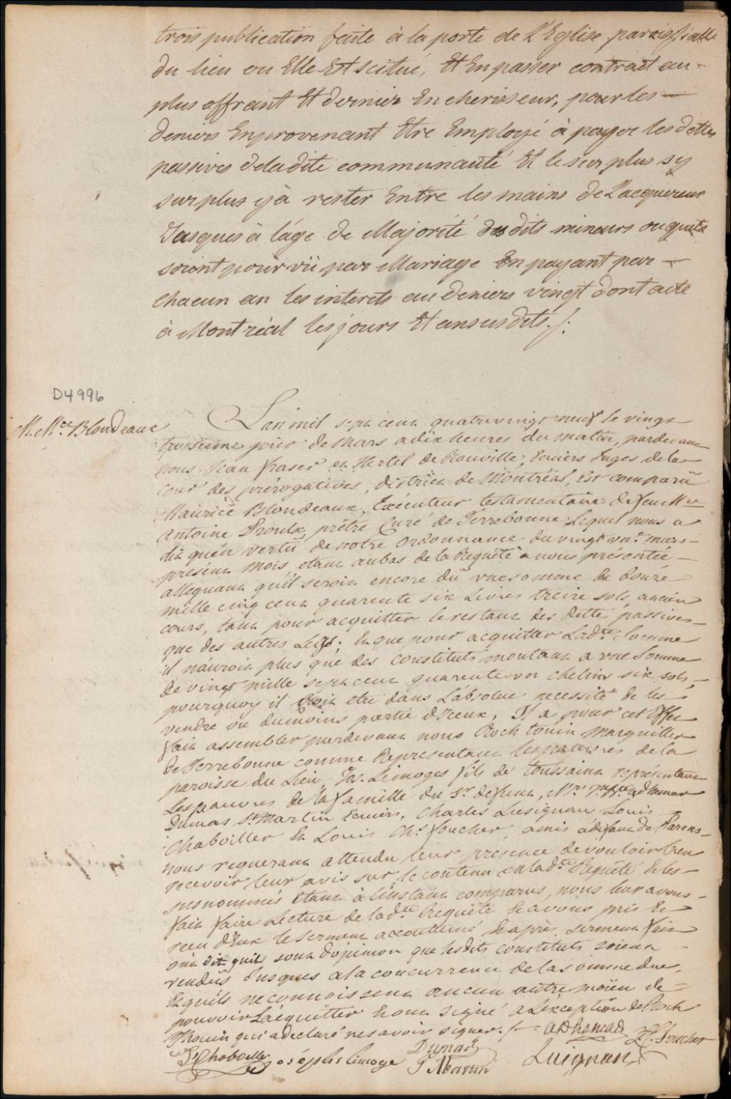 Autorisation à vendre de Maurice Blondeau, exécuteur testamentaire de feu Antoine Proulx, prête curé de Terrebonne, 23 mars 1789, Archives nationales à Montréal, Fonds Cour supérieure. District judiciaire de Montréal. Procédures en matières non contentieuses, (06M,CP601,S5,D4996).