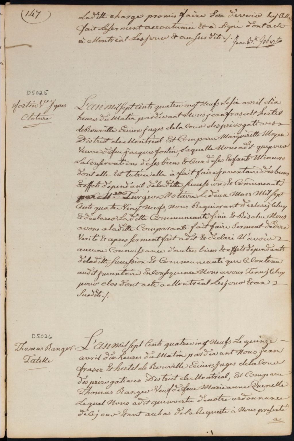 Tutelle des enfants mineurs de feu Marie Anne Quenelle [Marie Anne Quesnel] et de Thomas Ranger, 15 avril 1789, Archives nationales à Montréal, Fonds Cour supérieure. District judiciaire de Montréal. Procédures en matières non contentieuses, (06M,CP601,S5,D5026).