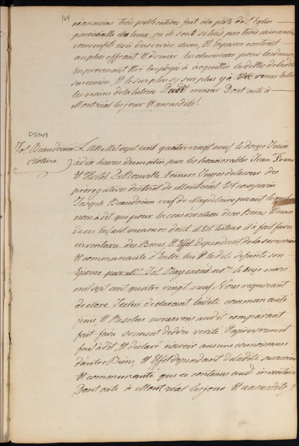 Clôture d'inventaire des biens de la succession et de la communauté de feu Madeleine Perrault et Joseph Baudouin