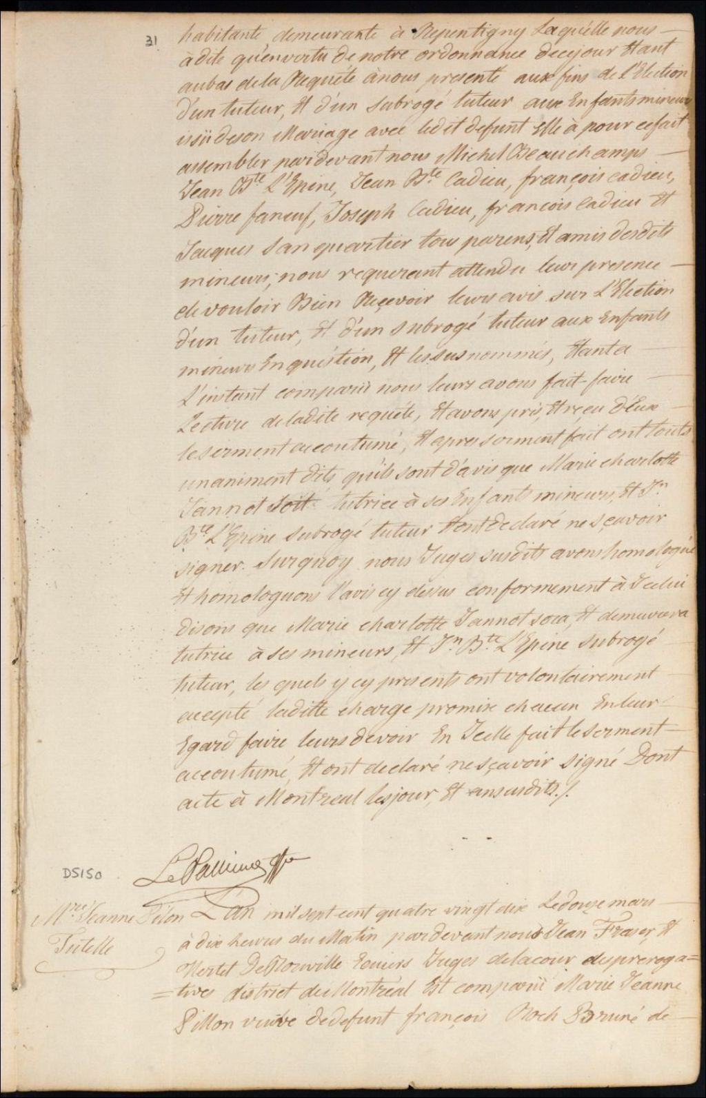 Tutelle des enfants mineurs de feu François Roch Bruné [François Larocque Larocquebrune] et de Marie Jeanne Pilon, 12 mars 1790, Archives nationales à Montréal, Fonds Cour supérieure. District judiciaire de Montréal. Procédures en matières non contentieuses, (06M,CP601,S5,D5150).
