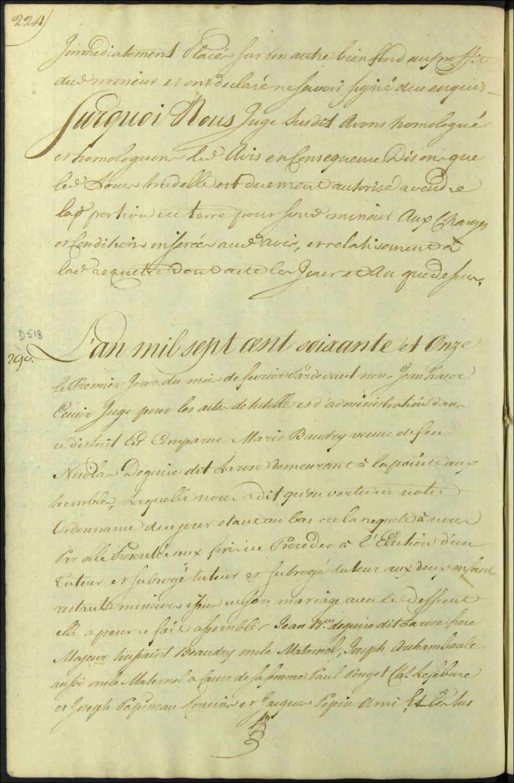 Tutelle des enfants mineurs de feu Nicolas Deguire Larose et de Marie Beaudry, 1 février 1771, Archives nationales à Montréal, Fonds Cour supérieure. District judiciaire de Montréal. Procédures en matières non contentieuses, (06M,CP601,S5,D518).