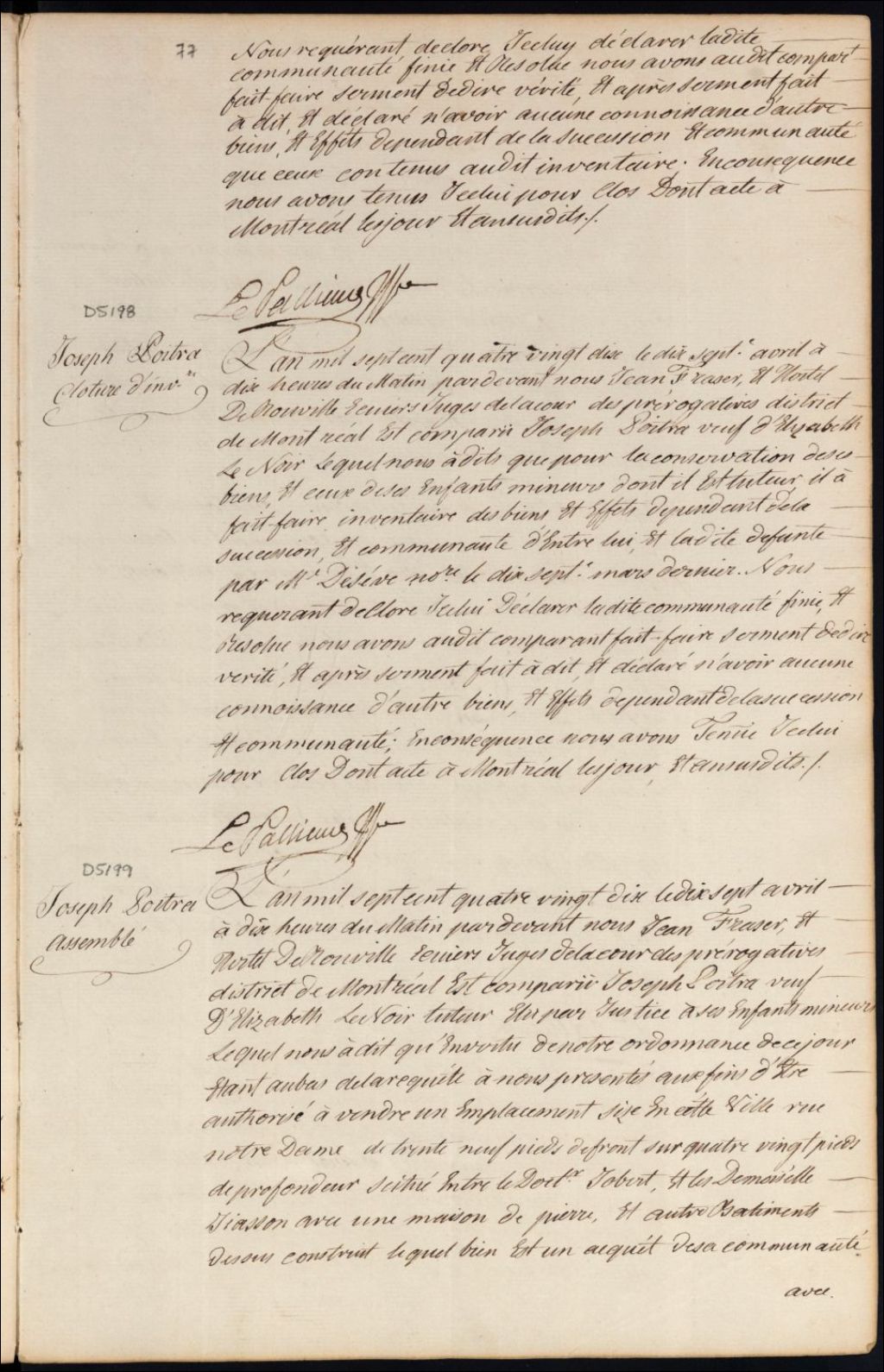 Tutelle des enfants mineurs de feu Élisabeth Lenoir et de Joseph Poitras - Administration tutélaire, 17 avril 1790, Archives nationales à Montréal, Fonds Cour supérieure. District judiciaire de Montréal. Procédures en matières non contentieuses, (06M,CP601,S5,D5199).