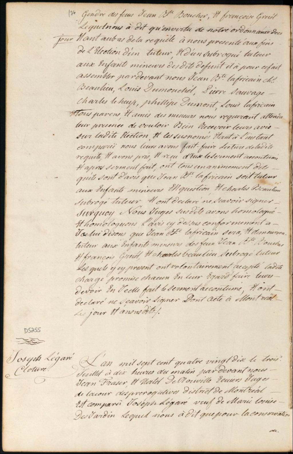 Clôture d'inventaire des biens de la succession et de la communauté de feu Marie Louise Desjardins et Joseph Légaré, 3 juillet 1790, Archives nationales à Montréal, Fonds Cour supérieure. District judiciaire de Montréal. Procédures en matières non contentieuses, (06M,CP601,S5,D5255).