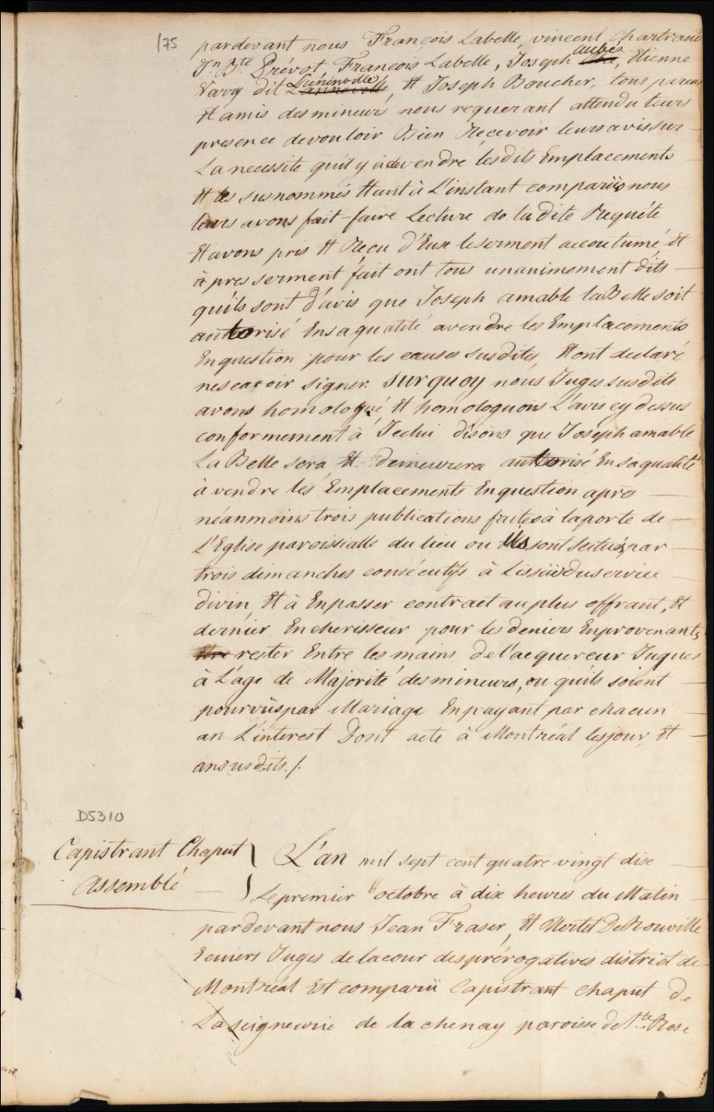 Tutelle des enfants mineurs de feu Agathe Mazurette Lapierre [Marie Agathe Mazure Lapierre] et de Capistran Chaput - Administration tutélaire, 1 octobre 1790, Archives nationales à Montréal, Fonds Cour supérieure. District judiciaire de Montréal. Procédures en matières non contentieuses, (06M,CP601,S5,D5310).