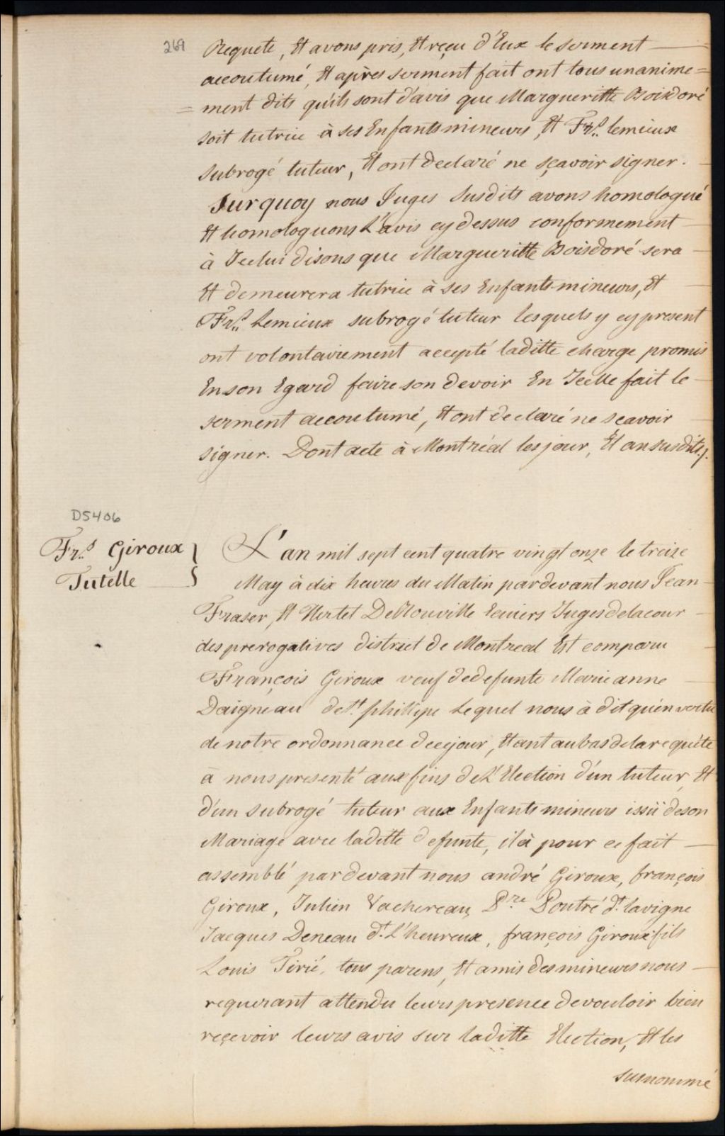 Tutelle des enfants mineurs de feu Marie Anne Daigneau [Marie Anne Deniau] et de François Giroux, 13 mai 1791, Archives nationales à Montréal, Fonds Cour supérieure. District judiciaire de Montréal. Procédures en matières non contentieuses, (06M,CP601,S5,D5406).