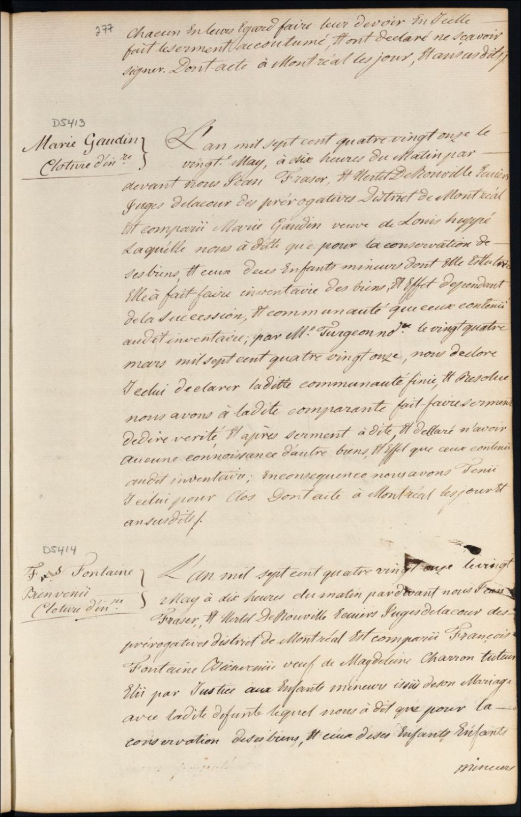 Clôture d'inventaire des biens de la succession et de la communauté de feu Madeleine Charon et François Fontaine Bienvenu, 20 mai 1791, Archives nationales à Montréal, Fonds Cour supérieure. District judiciaire de Montréal. Procédures en matières non contentieuses, (06M,CP601,S5,D5414).